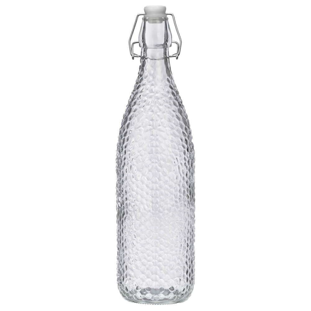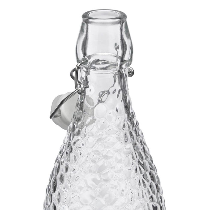 Realizada en vidrio transparente, la superficie de la botella presenta un diseño de puntos que no solo le da un toque estético, sino que también facilita el agarre, evitando deslizamientos accidentales. Su tapón mecánico con junta de silicona asegura un sellado hermético, evitando derrames y fugas no deseadas. Este diseño garantiza que tus bebidas se mantengan frescas y seguras, incluso cuando la botella se transporta.