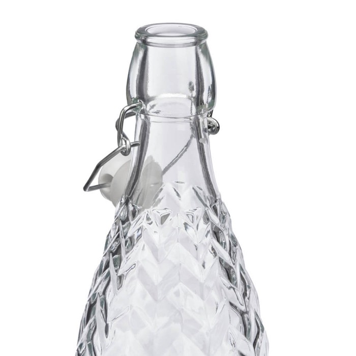 Realizada en vidrio transparente, la superficie de la botella presenta un diseño de zigzag en relieve que no solo le da un toque estético, sino que también facilita el agarre, evitando deslizamientos accidentales. Su tapón mecánico con junta de silicona asegura un sellado hermético, evitando derrames y fugas no deseadas. Este diseño garantiza que tus bebidas se mantengan frescas y seguras, incluso cuando la botella se transporta.