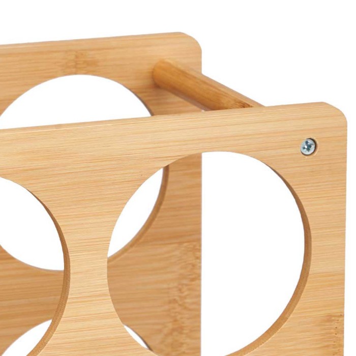 Botellero de madera de bambú con capacidad para 6 botellas. Ideal para mesas y encimeras, tamaño compacto y estilo natural. Medidas: 24 x 35 x 4 cm.