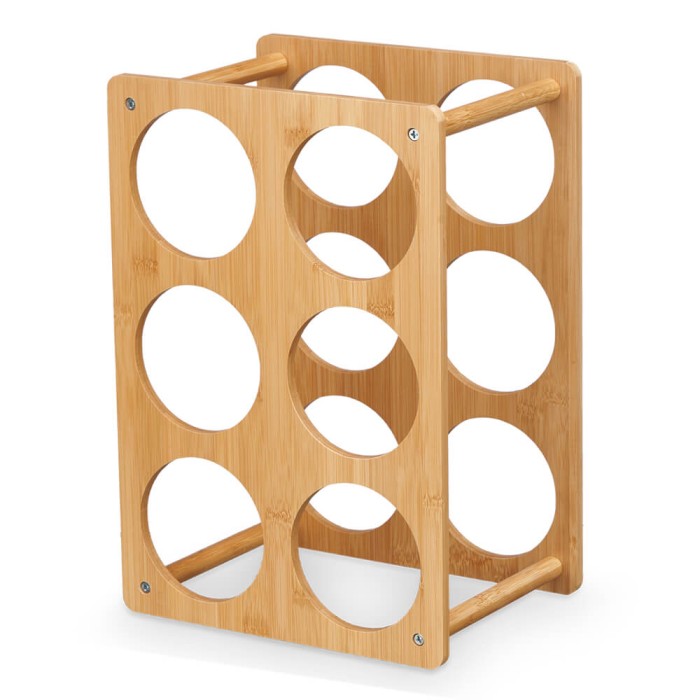 Fabricado en bambú natural, este botellero combina un estilo sencillo y funcional, añadiendo un toque cálido y sofisticado a la decoración de tu cocina, comedor o bar en casa. La estructura del botellero es resistente, proporcionando el soporte adecuado para mantener tus botellas seguras y ordenadas. El diseño del bambú también facilita la limpieza y el mantenimiento, lo que garantiza una larga vida útil del producto.