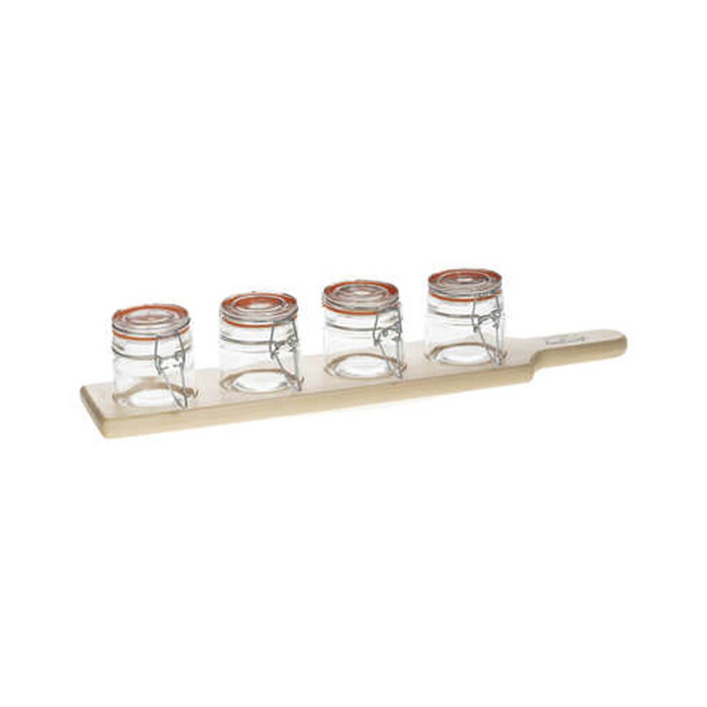 Set para servir aperitivos compuesto por una tabla de madera con 5 botes de cristal transparente.