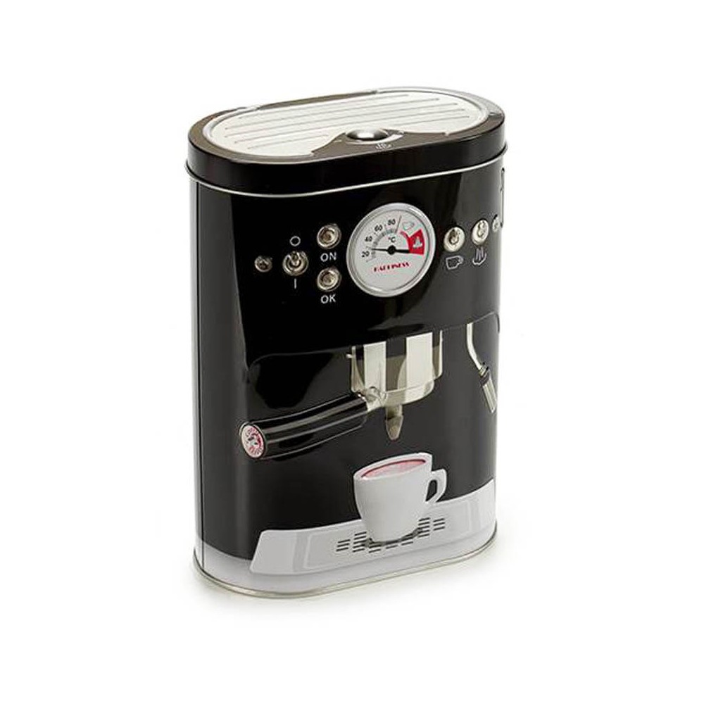 Bote para guardar café realizado en hojalata con un original diseño en forma ovalada de cafetera espresso, disponible en color rojo o negro acabado brillo. Con este bote de café funcional y decorativo podrás mantener el café organizado y siempre a mano para que cada mañana te resulte más cómodo preparar el café.