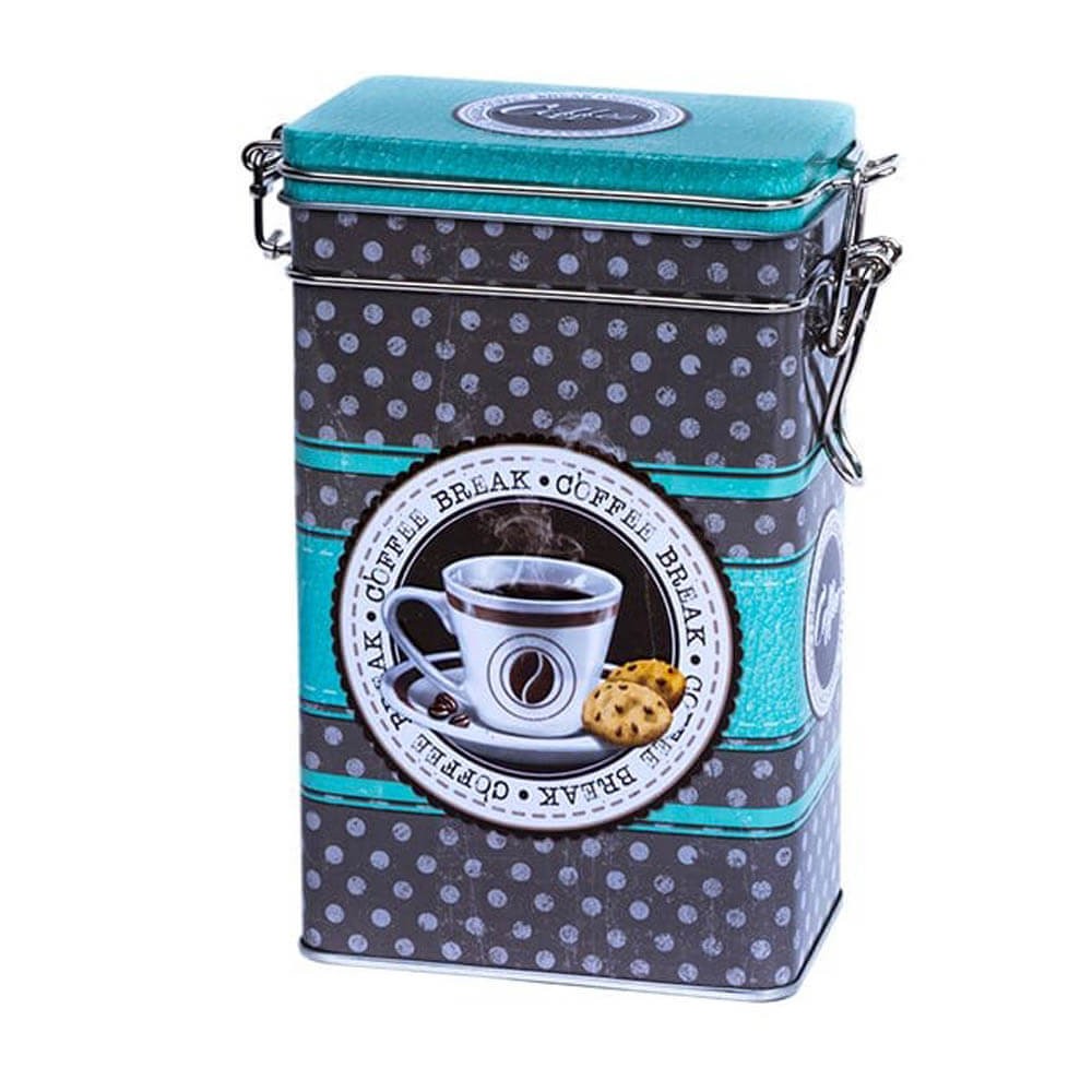 Bote para café rectangular con tapa con cierre de clip metálico, diseño moderno y fresco en tonos azules y marrones, lleva el fondo decorado con lunares de efecto desgastado y en el frontal un sello con una taza de café y unas galletas, coffe break!. La caja de metal lucirá perfecta en la alacena y te ayudara a mantener la cocina ordenada, perfecta para guardar y conservar las cualidades del café.