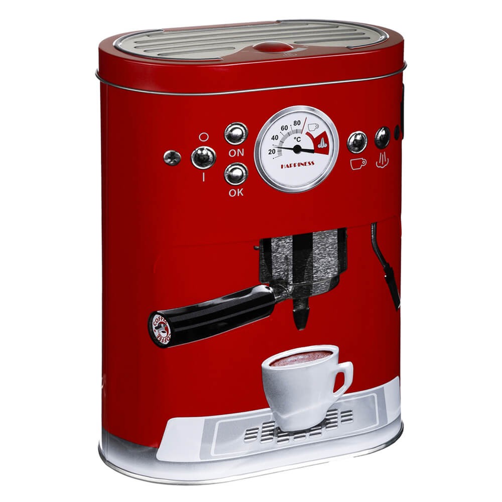 Bote para guardar café realizado en metal con un original diseño de cafetera espresso con forma ovalada y detalles en relieve, disponible en color rojo, marfil o negro, acabado brillo.