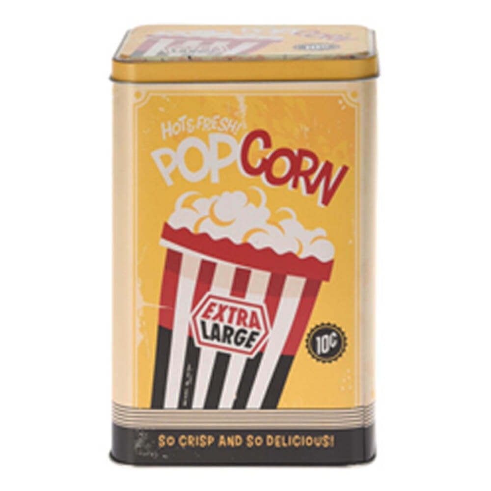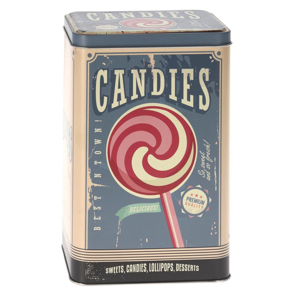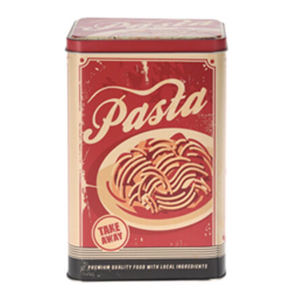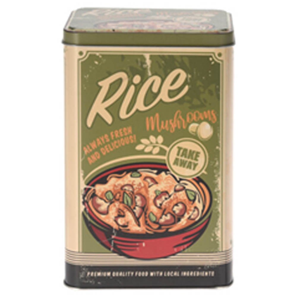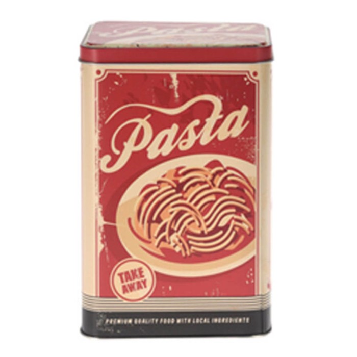Bote de cocina rectangular en formato vertical con las esquinas redondeadas, fabricado en metal resistente con un atractivo y original diseño de estilo vintage con dibujos envejecidos. 4 modelos según disponibilidad, Candies, Pasta, Pop corn o Rice.