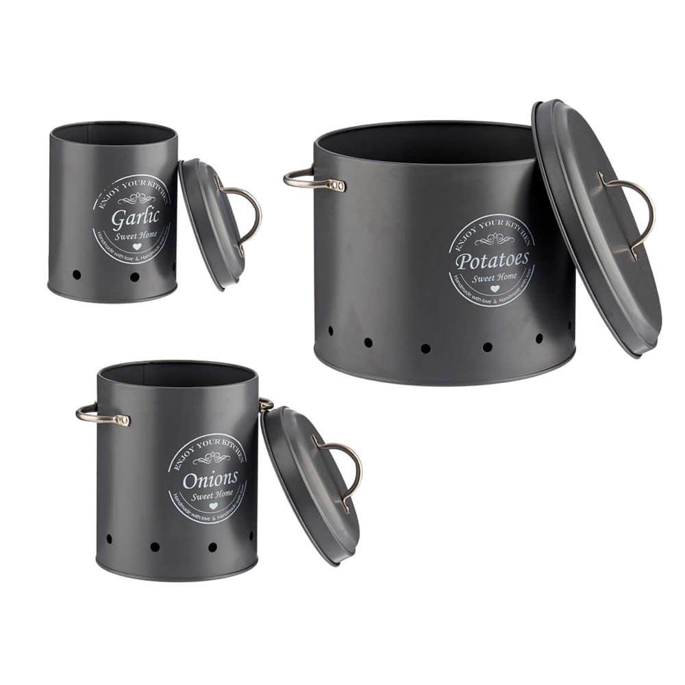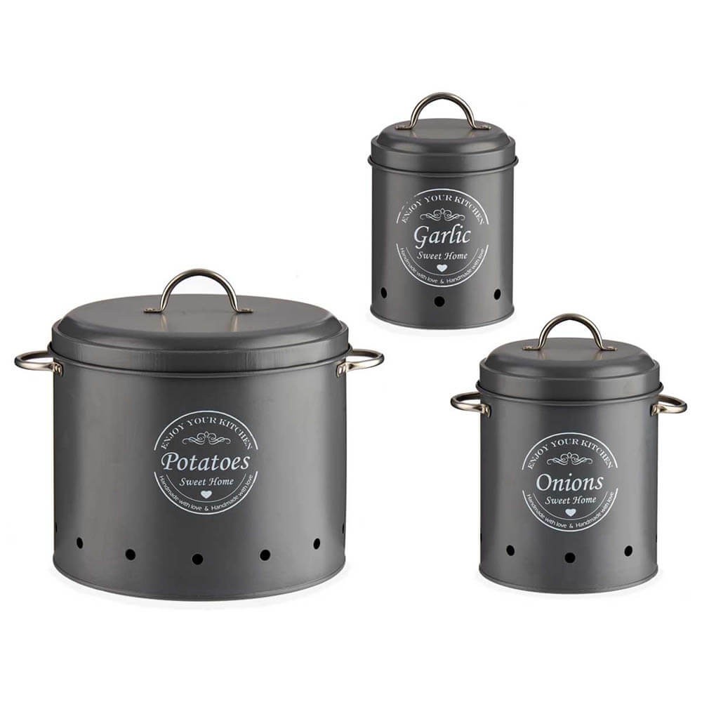 3 Botes de cocina metálicos para guardar patatas, cebollas y ajos.