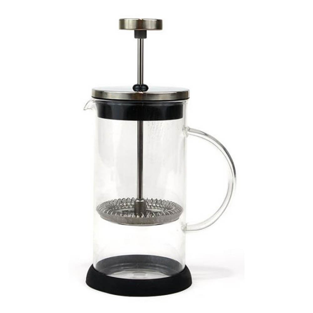 Cafetera de émbolo fabricada en vidrio borosilicato resistente a los cambios de temperatura con filtro robusto metálico, perfecta para preparar café o té.