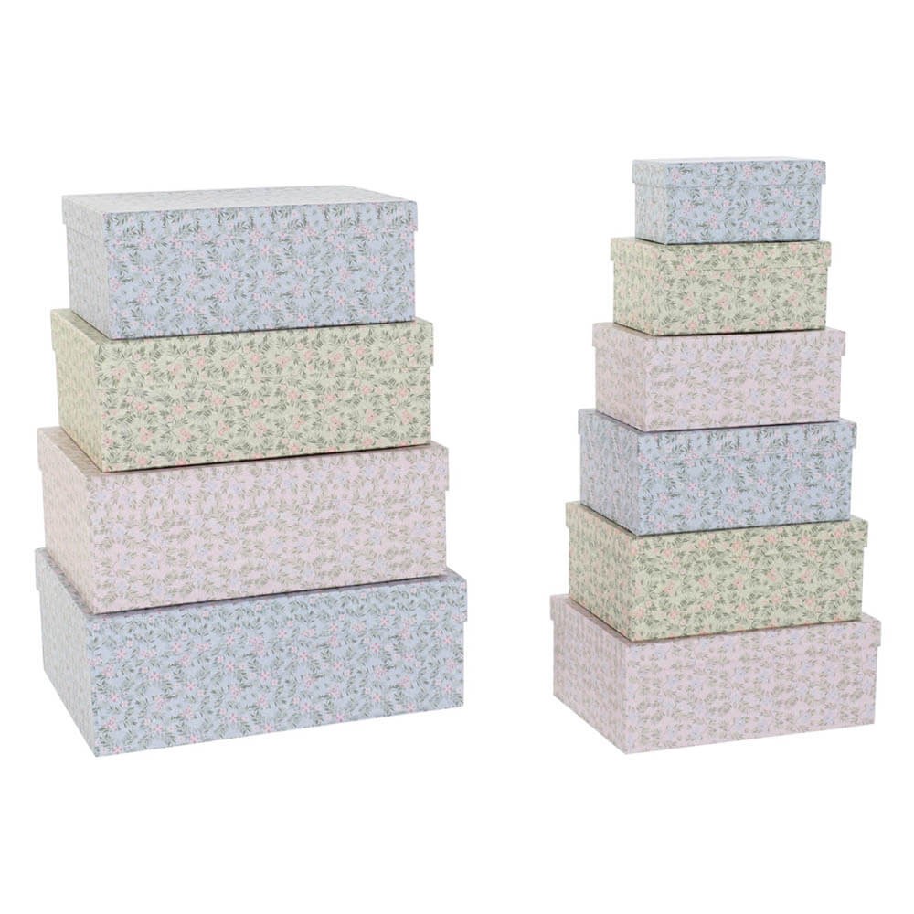 Caja de cartón rectangular diseño victoriano decorada con pequeñas flores de estilo inglés sobre fondo rosa, perfecta para guardar y organizar diferentes objetos ayudándote a mantener el orden en casa.