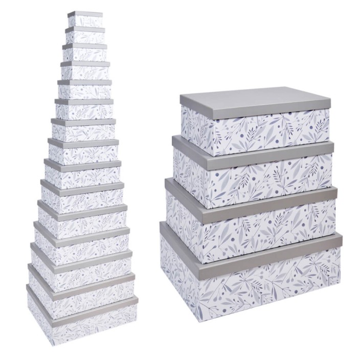 Organiza los armarios y estanterías de tu hogar u oficina con la caja de cartón decorativa con un bonito diseño de hojas en tonos grises. Fabricada con cartón de 1200 gr y 2 mm de grosor, esta caja multiusos garantiza una protección óptima para tus objetos.