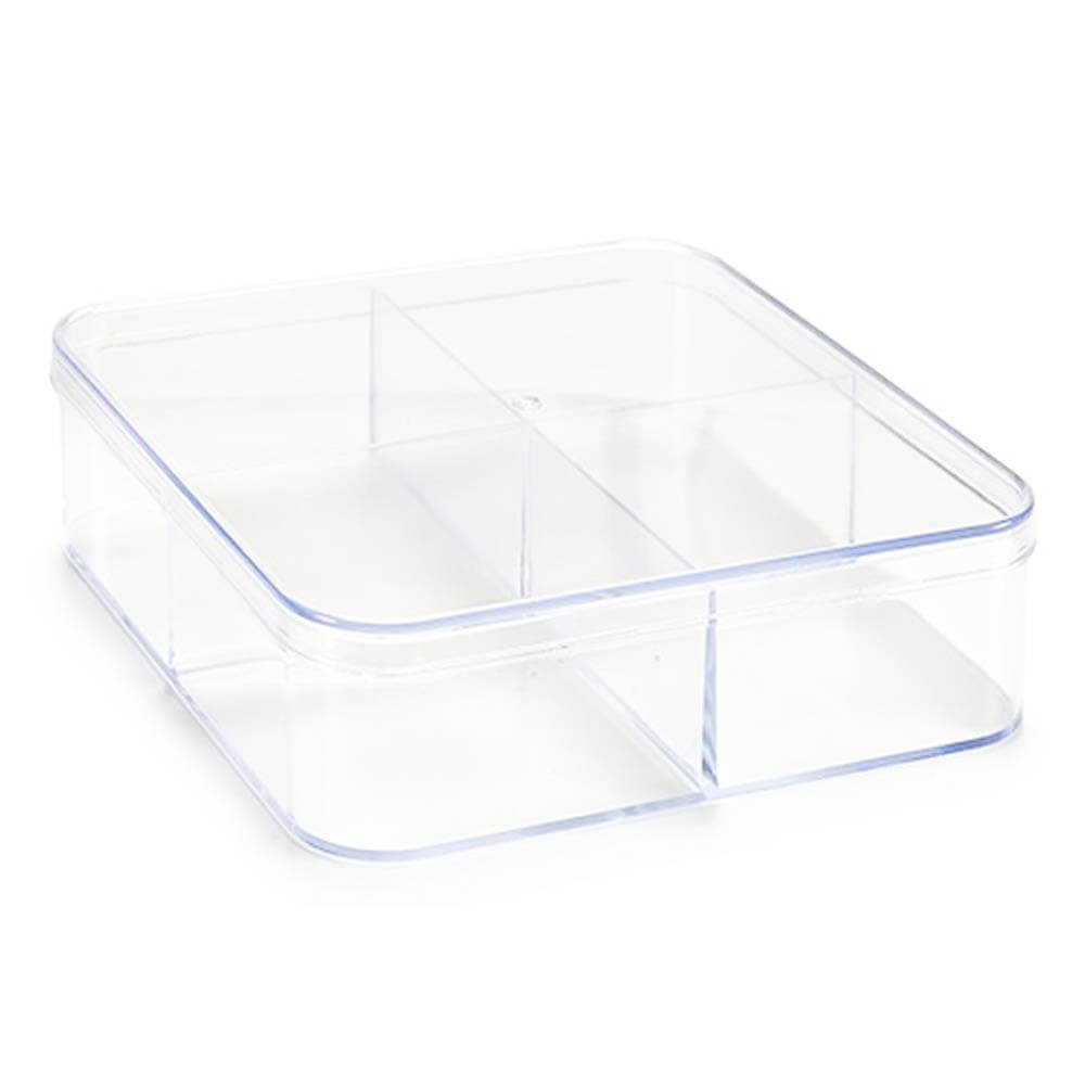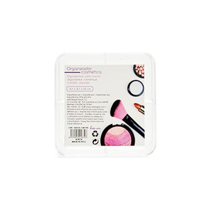 Organizador para cosméticos cuadrado realizado en poliestireno transparente, cuenta con 4 huecos y tapa.