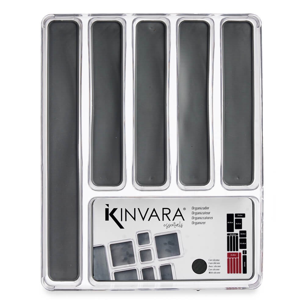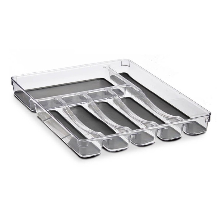 Con unas medidas de 40 x 32,3 x 4,5 cm, este organizador se adapta a la mayoría de los cajones estándar, permitiendo una optimización del espacio sin complicaciones. Además, su diseño limpio y moderno en gris y transparente se integra fácilmente con cualquier estilo de cocina, aportando una apariencia organizada y elegante.