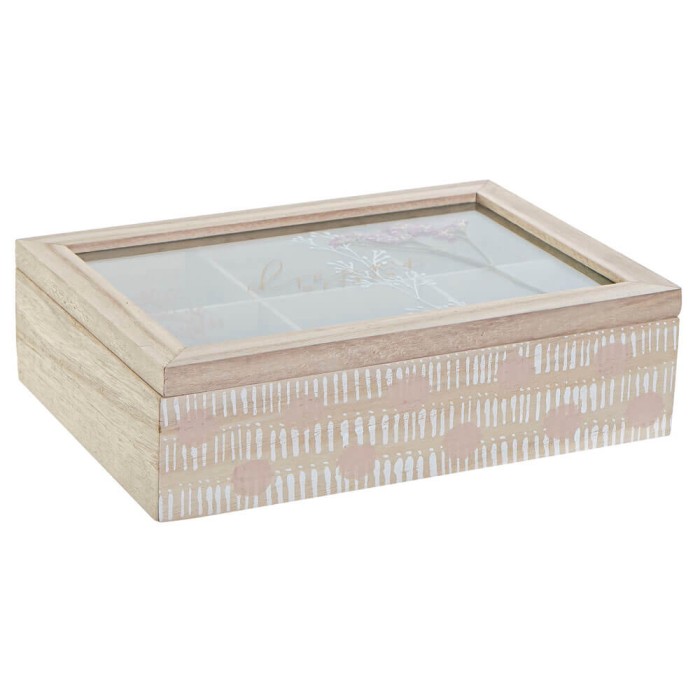 Caja de té fabricada en madera MDF de color natural con 6 compartimentos para organizar y conservar las bolsitas de té, formada por un contenedor rectangular con divisiones internas y una tapa con ventana de cristal para ver el contenido en todo momento.