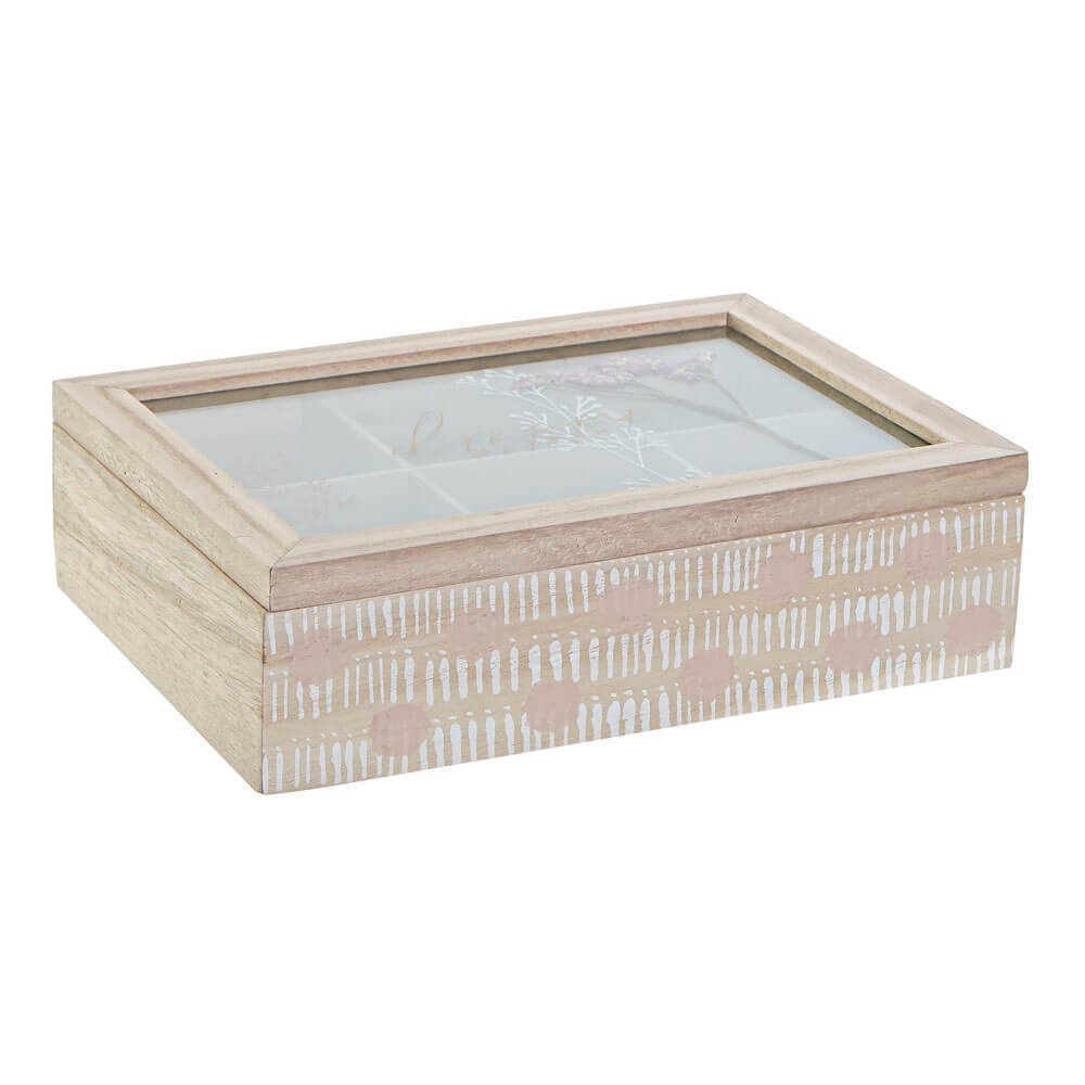 Si te gusta cuidar cada detalle y buscas la mejor presentación, esta caja para té de estilo cottage en color natural con la tapa decorada con flores es perfecta para que la lleves a la mesa después de una comida y que tus invitados puedan elegir entre una amplia selección de tés.