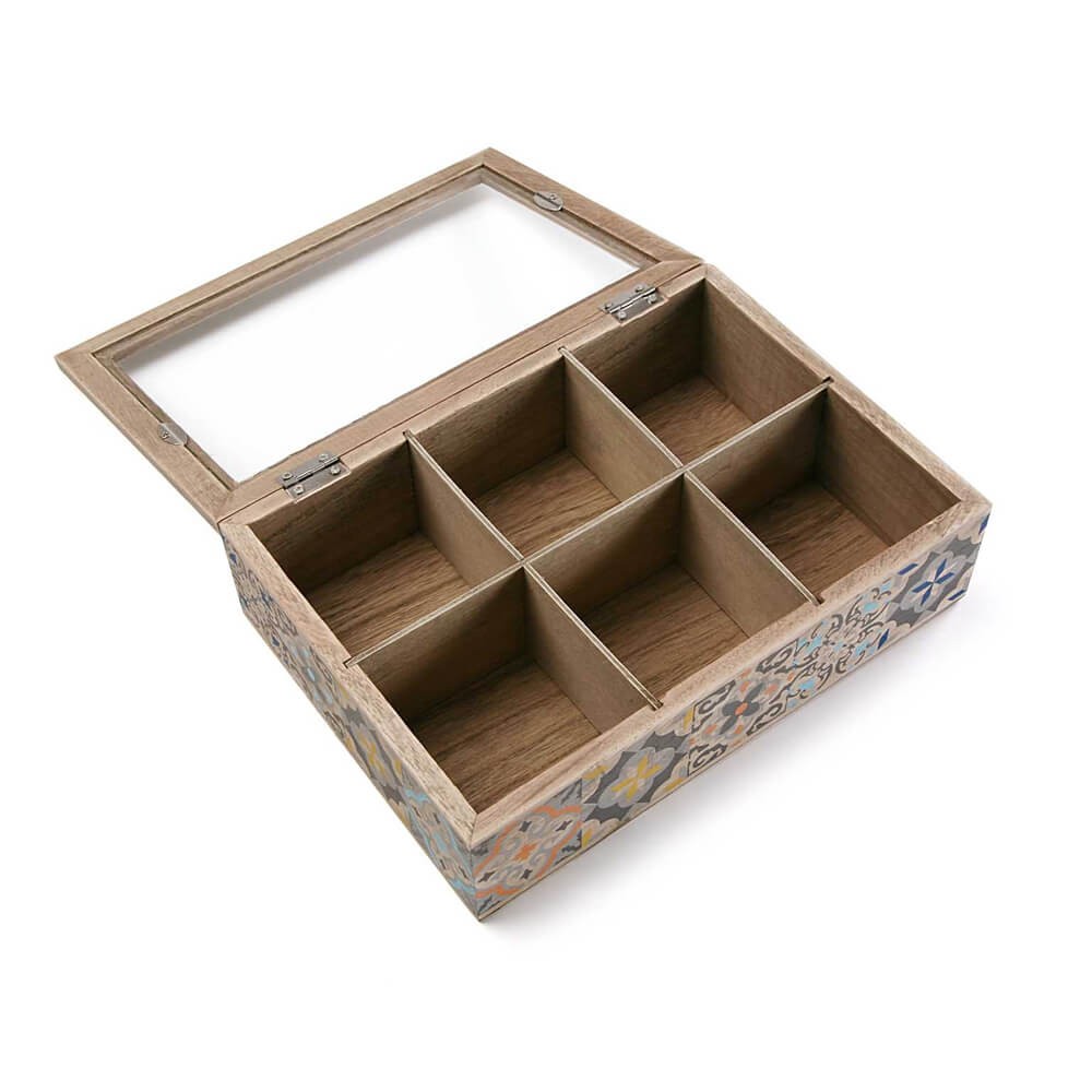 Descubre la elegancia y funcionalidad de la caja de té realizada en madera con 6 compartimentos. Esta caja de almacenaje es perfecta para guardar y clasificar tus bolsitas de té, asegurando que siempre tengas a mano tu selección favorita. Su diseño en madera natural con el borde decorado con pinturas de azulejos, junto con una ventana decorativa de cristal, permite identificar fácilmente el contenido sin necesidad de abrirla, añadiendo un toque de sofisticación a tu cocina o comedor.