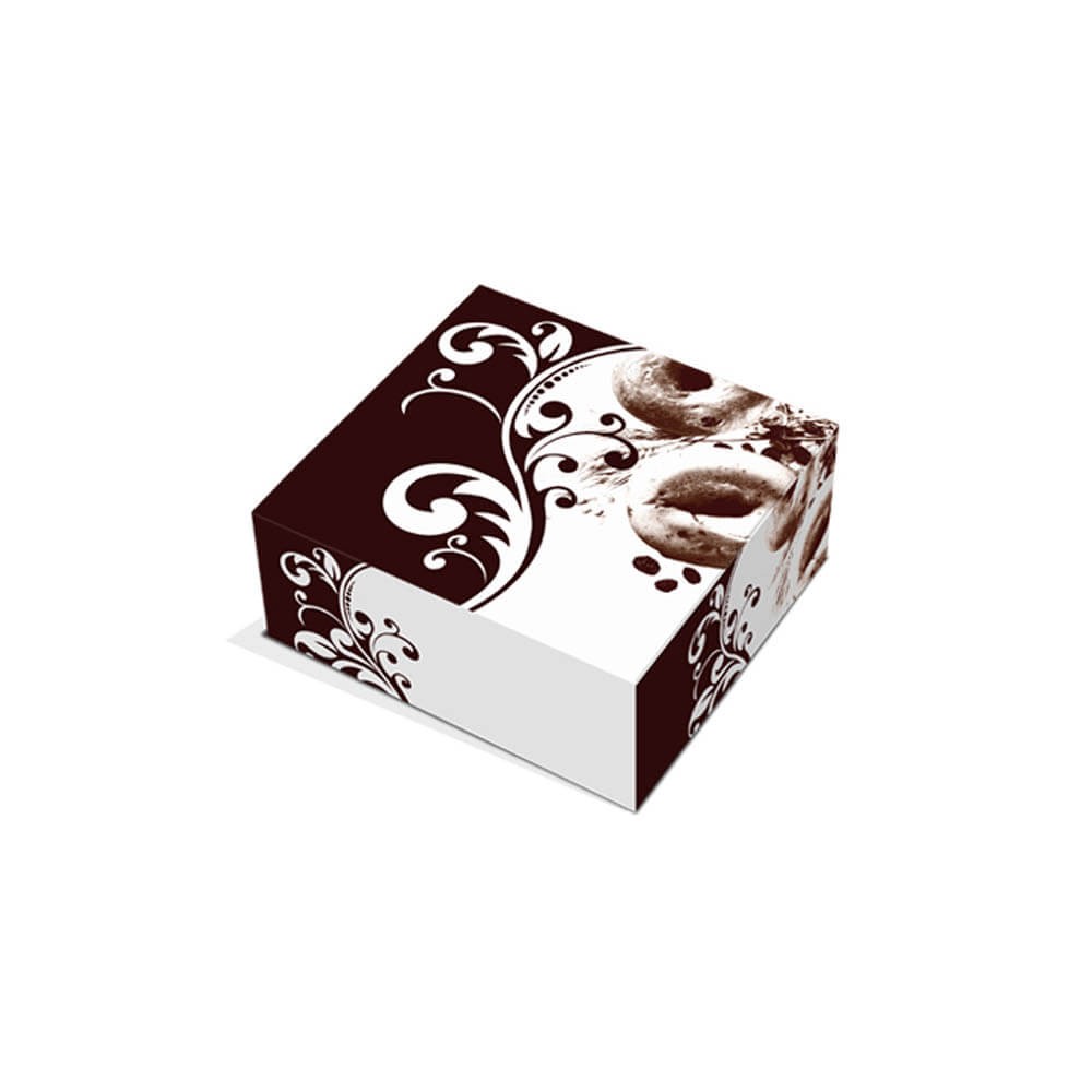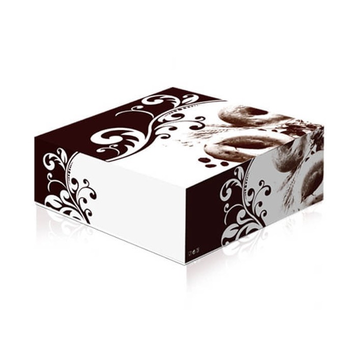 Caja de cartón de 9,5 cm de altura decorada con motivos en blanco y marrón. Una caja resistente perfecta para meter y transportar tartas, dulces, empanas y demás alimentos.