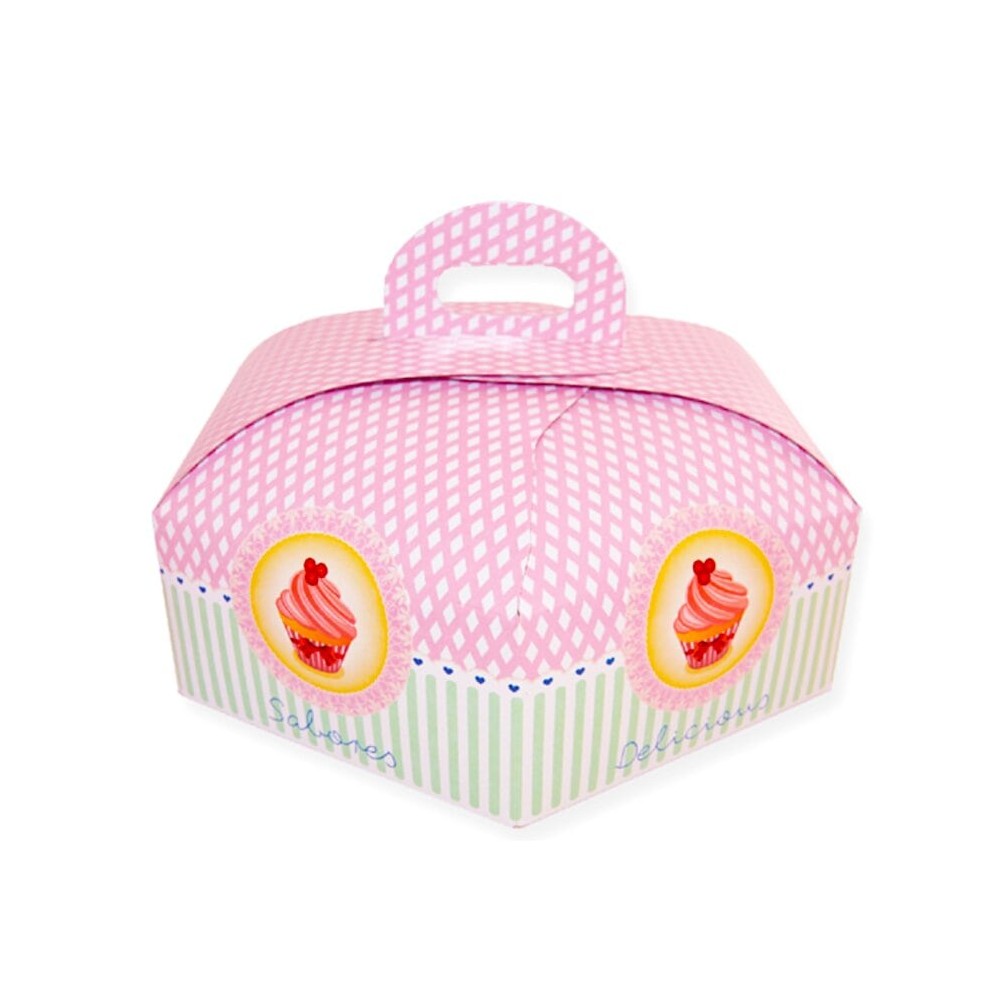 Caja de cartón hexagonal con una altura de 10 cm y asa superior, perfecta para transportar elaboraciones con facilidad y comodidad. La caja para tarta esta realizada en cartón resistente con un maravilloso y coqueto diseño en color rosa y verde decorada con pasteles.