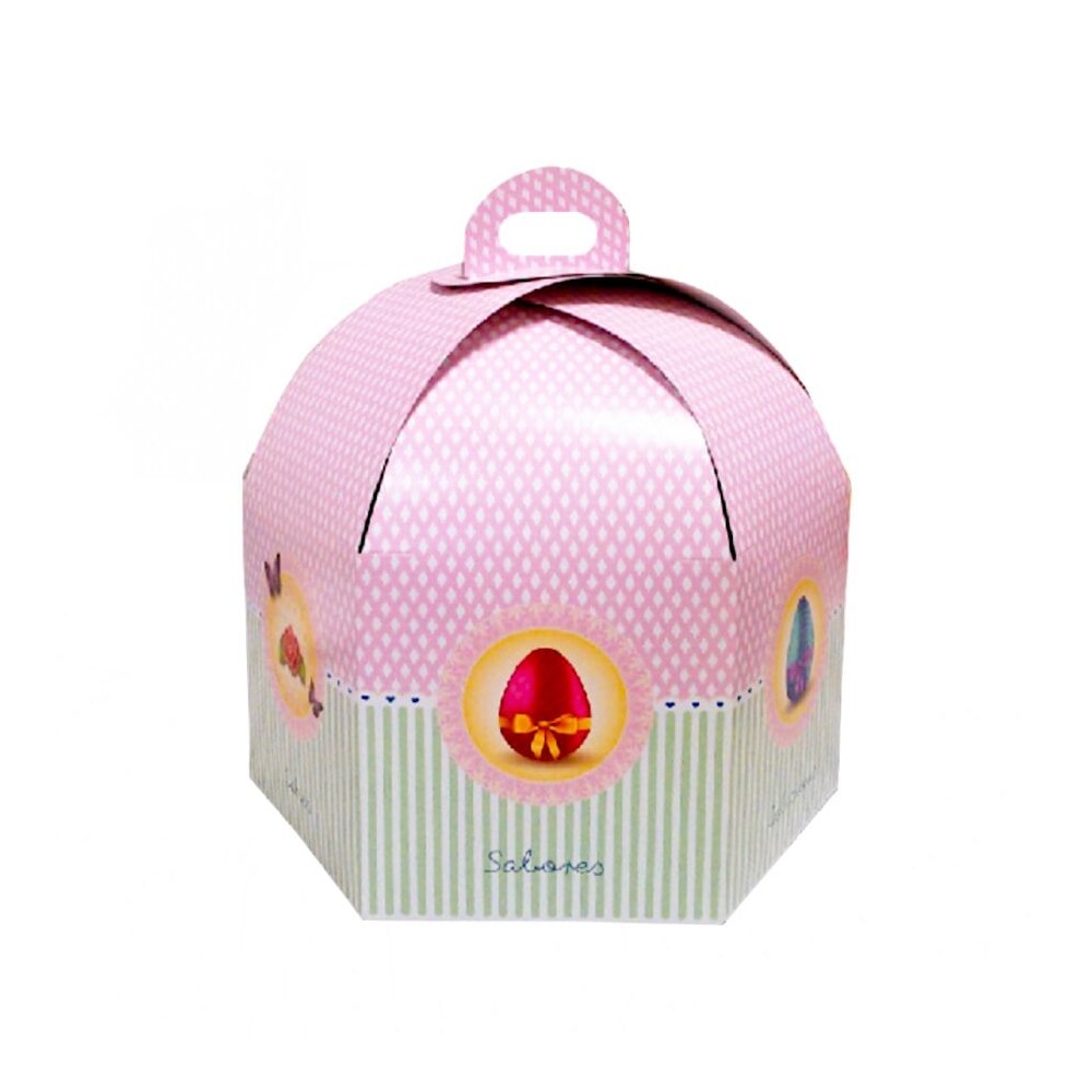 Caja hexagonal con asa y altura especial para transportar elaboraciones altas, diseño rosa y verde.