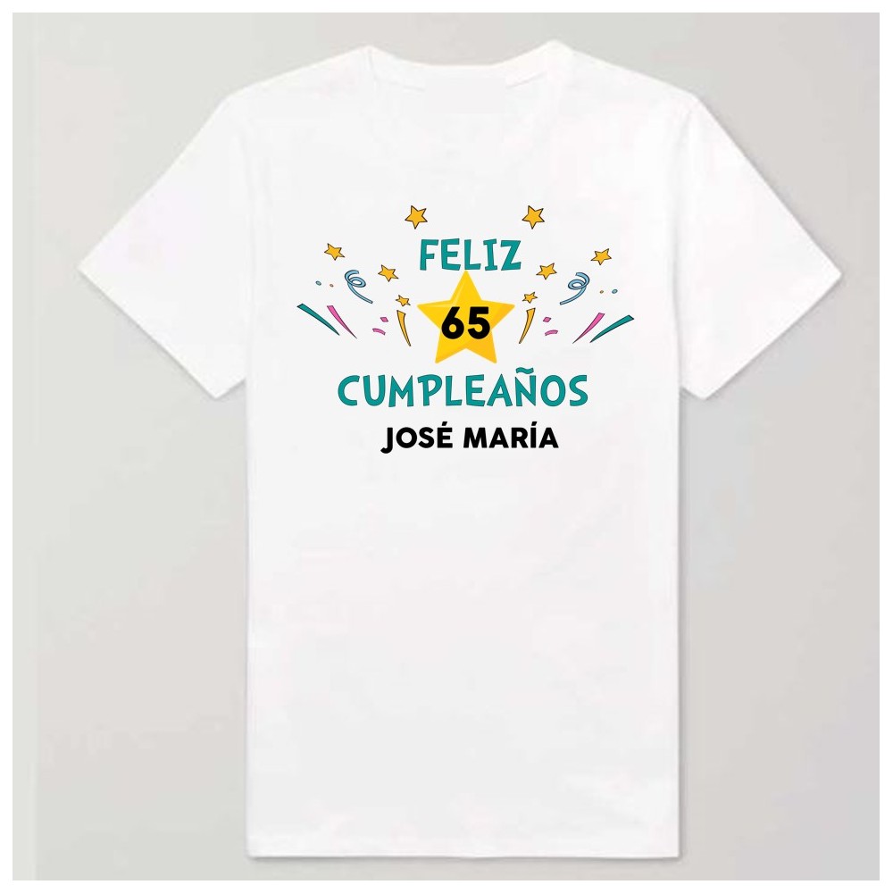 Nuestra camiseta destaca por su diseño alegre y personalizable. Está decorada con una estrella con la edad del cumpleañero y el mensaje "Feliz cumpleaños" en el centro de la camiseta, añadiendo un toque de celebración y diversión.