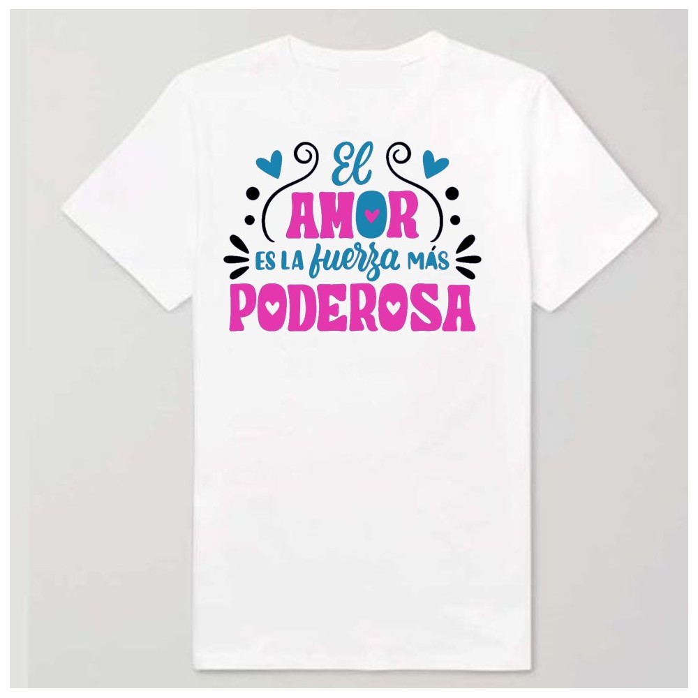 La camiseta blanca destaca por la frase "El amor es la fuerza más poderosa", impresa en color rosa y azul con una tipografía moderna y divertida. Es el regalo ideal para celebrar el amor en fechas especiales como San Valentín o aniversarios, o simplemente para expresar tus sentimientos de una manera única y especial.