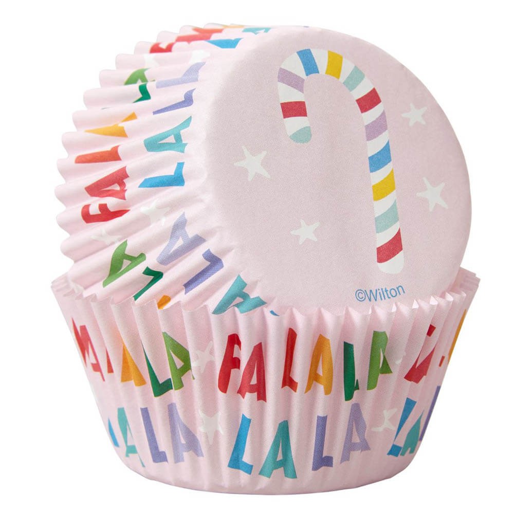 Cápsulas de papel para hornear de la marca Wilton decoradas con un bastón de caramelo en la base y estrellas. Estas cápsulas son ideales para realizar magdalenas y cupcakes navideños.