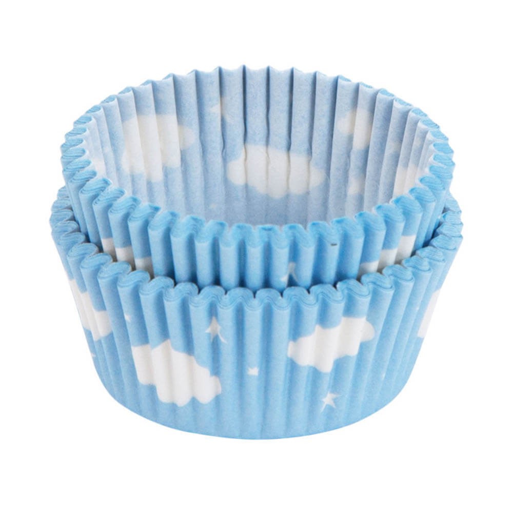 Cápsulas para hornear cupcakes de la marca ALLC decoradas con una dulce nube en la base sobre fondo azul con estrellas y nubes blancas. Estos papeles para magdalenas son ideales para fiestas infantiles, baby showers, etc.