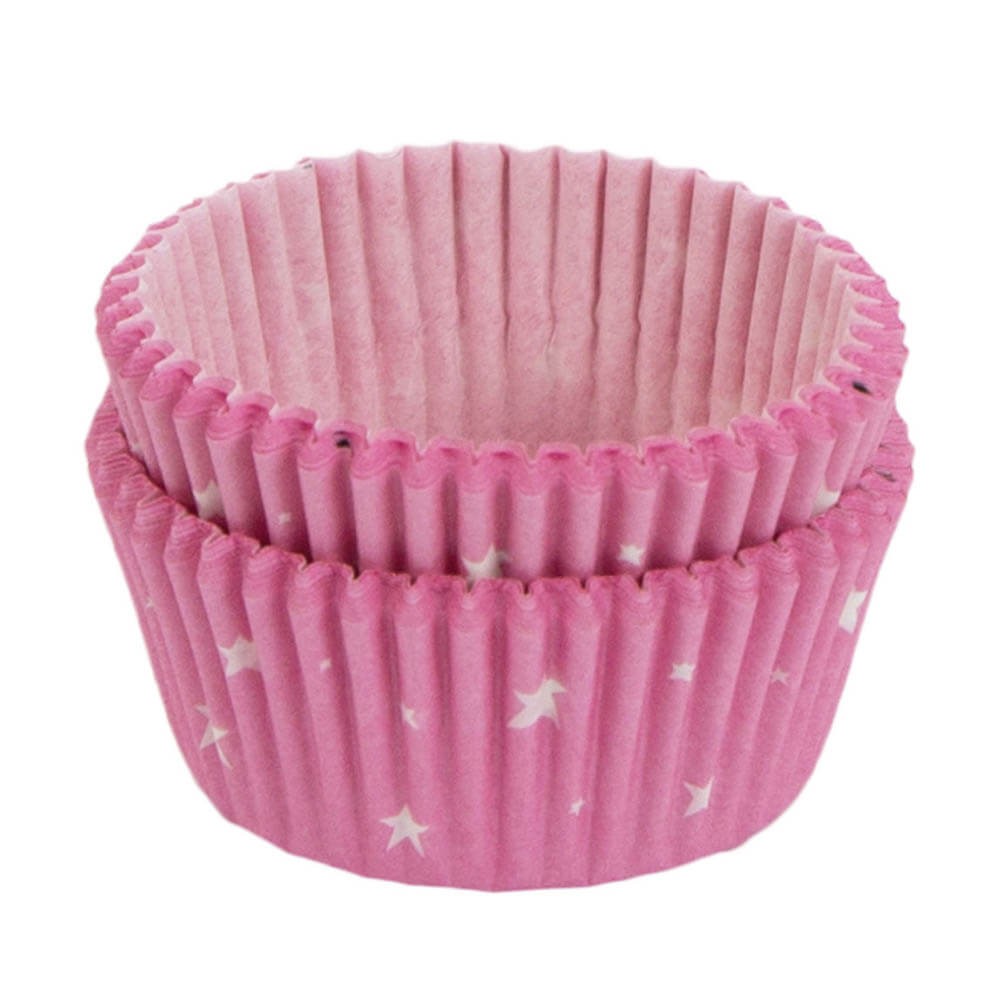 Cápsulas para hornear cupcakes de la marca ALLC decoradas con una dulce estrella en la base sobre fondo rosa con estrellas blancas. Estos papeles para magdalenas son ideales para fiestas infantiles, baby showers, etc.