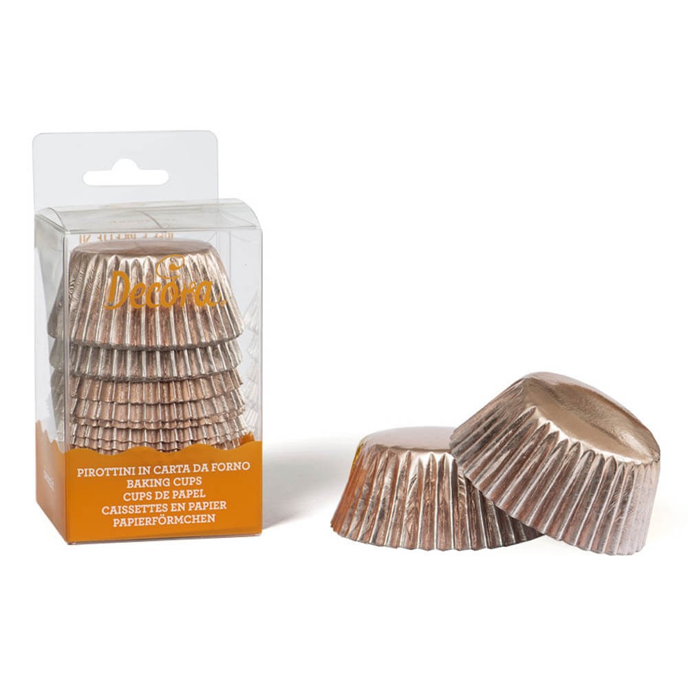 Pack de 60 cápsulas de papel de horno en color oro rosa metalizado con 5 cm de diámetro, perfectas para que hornees cupcakes, magdalenas y dulces para ti y tu familia. Las cápsulas para hornear son resistentes hasta 220º y vienen presentadas en un práctico blíster de plástico. Perfectas para uso diario y todo tipo fiestas y eventos. Medidas: ø 50x32 h mm