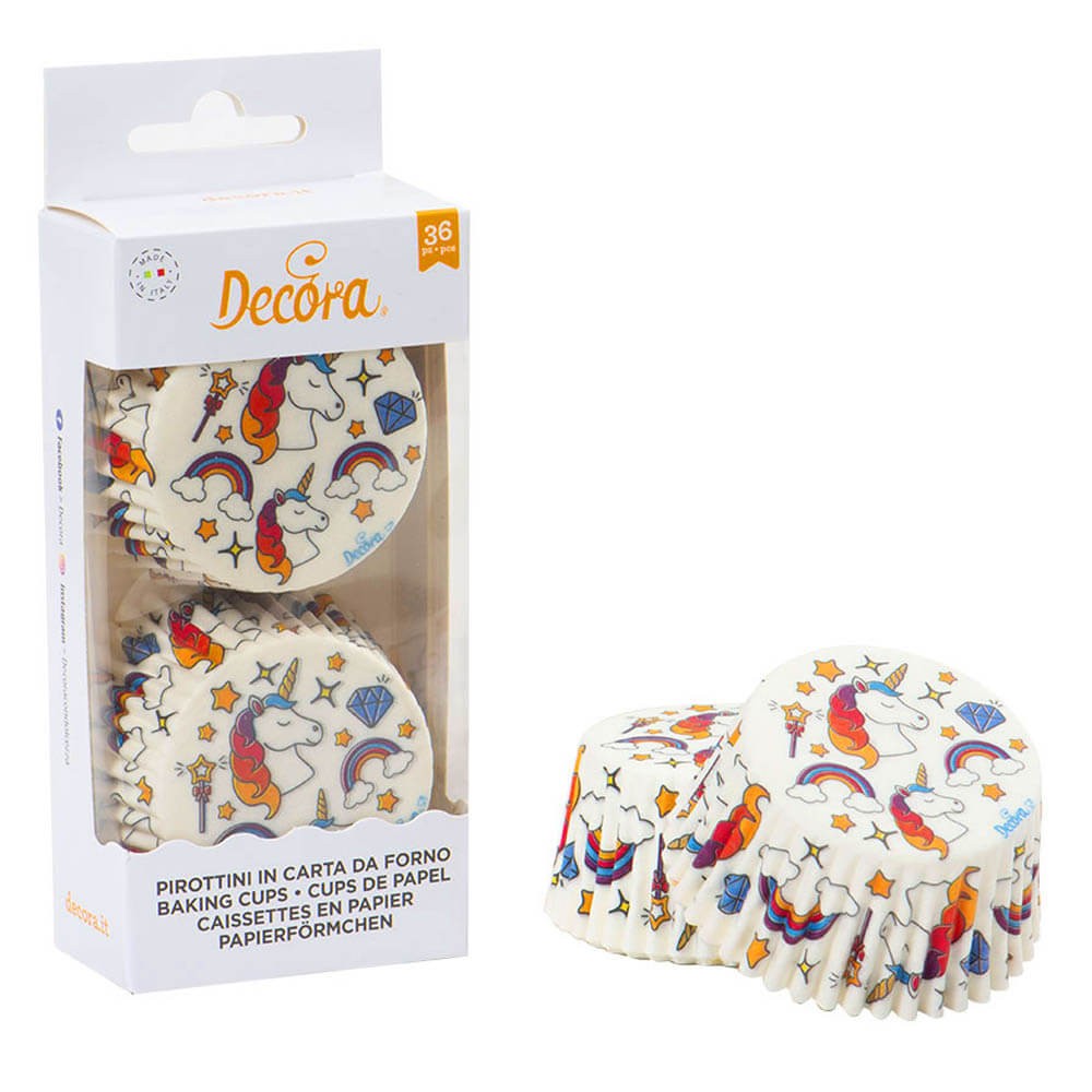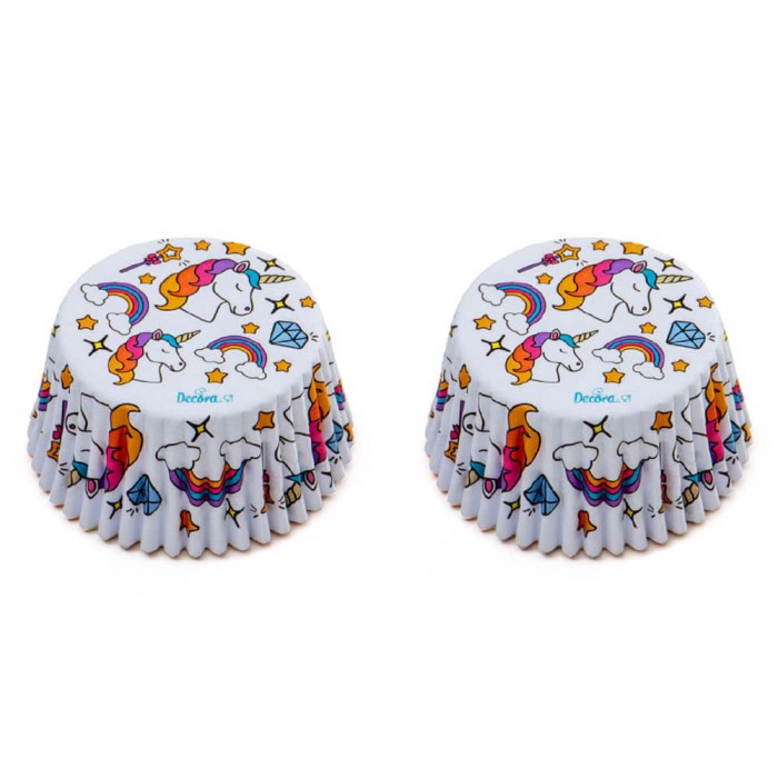 Cápsulas de papel de horno diseño Unicornio de la marca Decora con 5 cm de diámetro, perfectas para hornear y presentar cupcakes, magdalenas y dulces. Las cápsulas para hornear son resistentes hasta 220º, vienen presentadas en un envase de plástico.