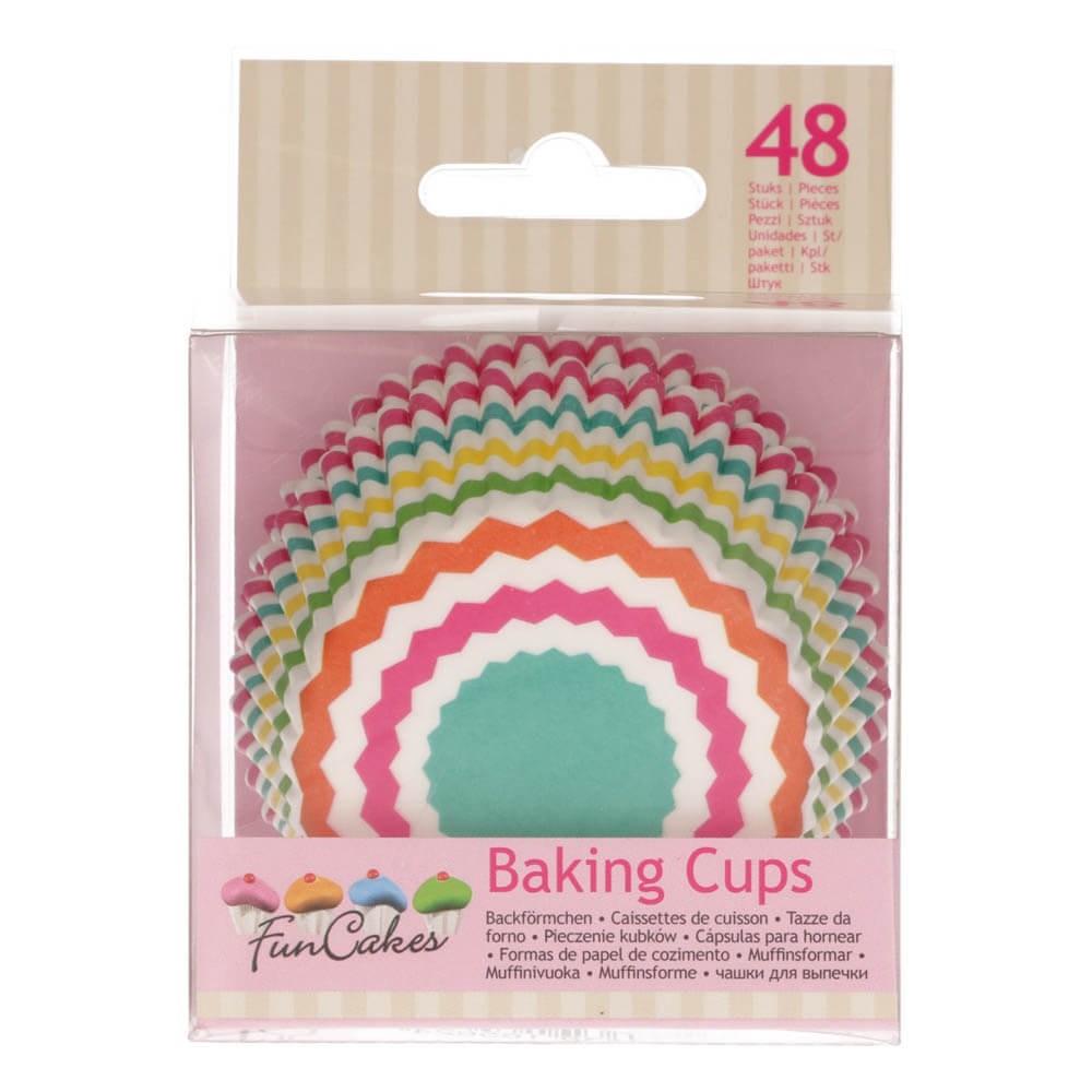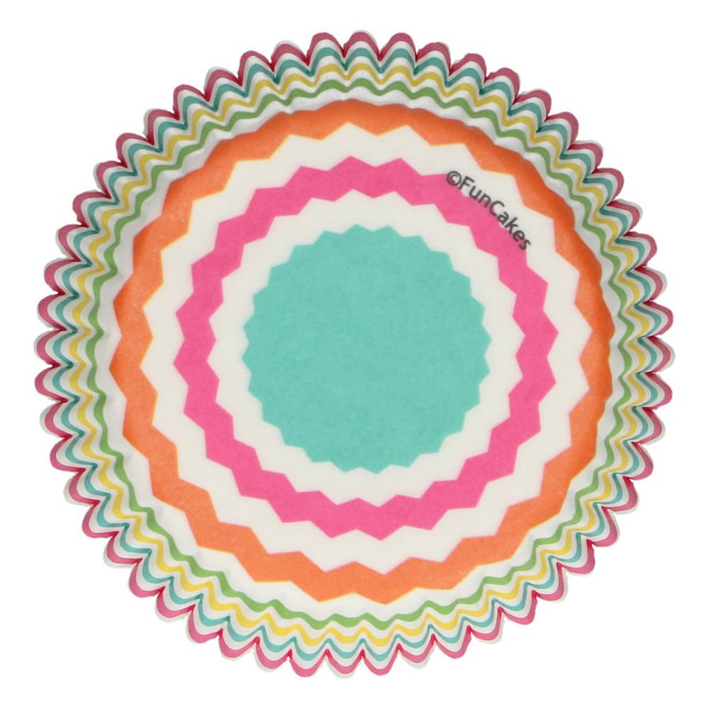 Cápsulas de papel de horno de la marca FunCakes diseño Chevron con un colorido y hermoso estampado de líneas sobre fondo blanco, perfectas para hornear y presentar deliciosos cupcakes y magdalenas.