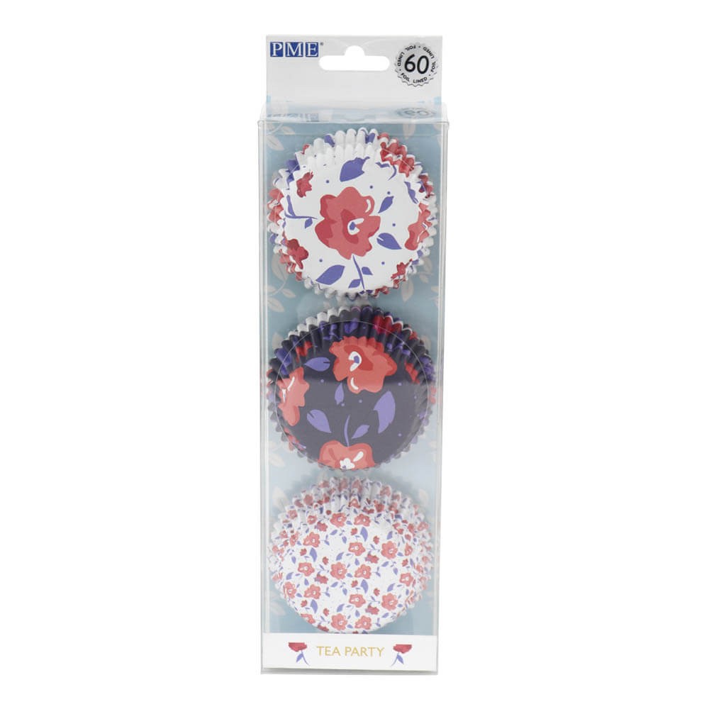 Cápsulas de papel de horno diseño fiesta de té de la marca PME con tres maravillosos diseños florales, perfectas para hornear y presentar cupcakes, magdalenas o brownies para fiestas y eventos.