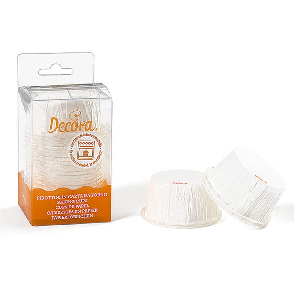 Pack de 25 cápsulas rizadas para cupcakes de la marca Decora en color blanco, realizadas en papel resistentes hasta 220°C. Perfectas para hornear cupcakes y magdalenas de tamaño estándar. Ø 55 x 35 h mm.