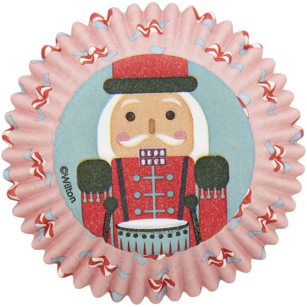 Cápsulas de papel navideñas de la marca Wilton decoradas con muñeco casca nueces en la base, perfectas para preparar dulces navideños. Estas cápsulas son ideales para hornear magdalenas y cupcakes para las fiestas navideñas.