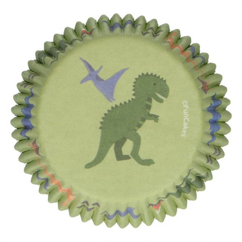 Cápsulas de papel para hornear fabricadas en papel de alta calidad y anti-grasas de la marca FunCakes, diseño dino decoradas con un divertido patrón de dinosaurios sobre fondo verde, perfectas para hornear cupcakes y magdalenas.