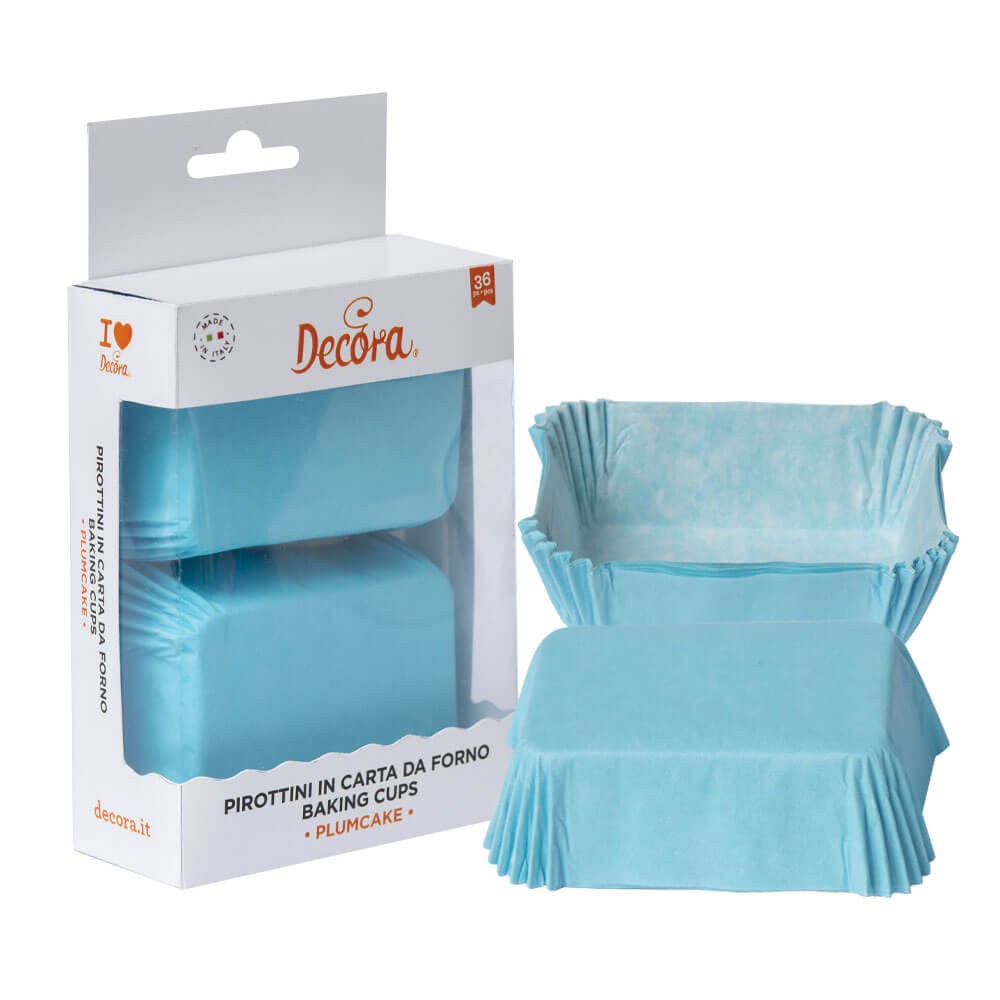 36 Cápsulas de papel de horno en color azul, perfectas para hornear, presentar y regalar pasteles y mini bizcochos de formato rectangular.