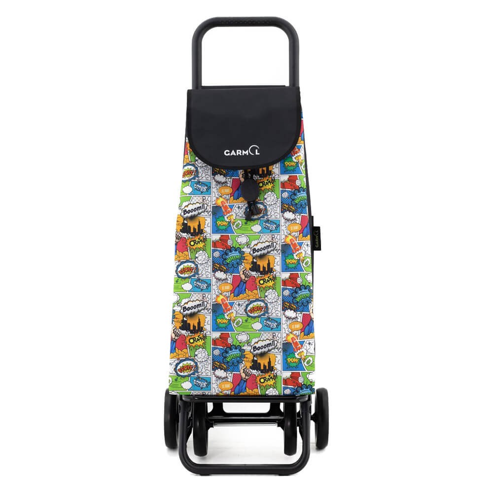 Fantástico carro de la compra con 4 ruedas para que puedas llevar la comida a casa cómodamente y con estilazo gracias a su divertido diseño de tebeo, lleva bolsa de 55L en nylon resistente con dos bolsillos para que puedas guardar tus pertenencias con seguridad.