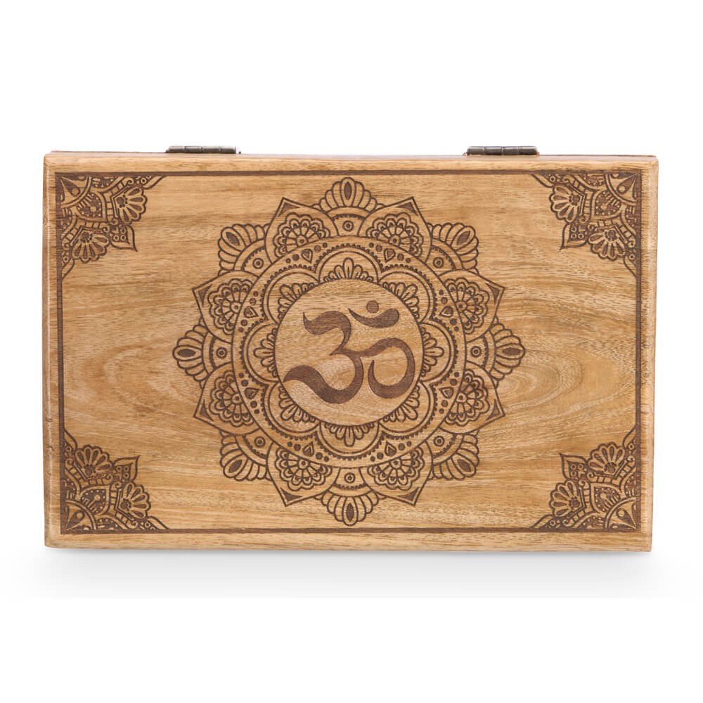 Hecha de madera de mango, conocida por su durabilidad y su hermoso grano, esta caja ofrece no solo un almacenamiento seguro sino también una estética impresionante. La tapa está finamente tallada con el diseño OM, un símbolo sagrado en diversas culturas que representa el sonido primordial y la esencia de la realidad, añadiendo un toque de espiritualidad y serenidad a cualquier espacio.