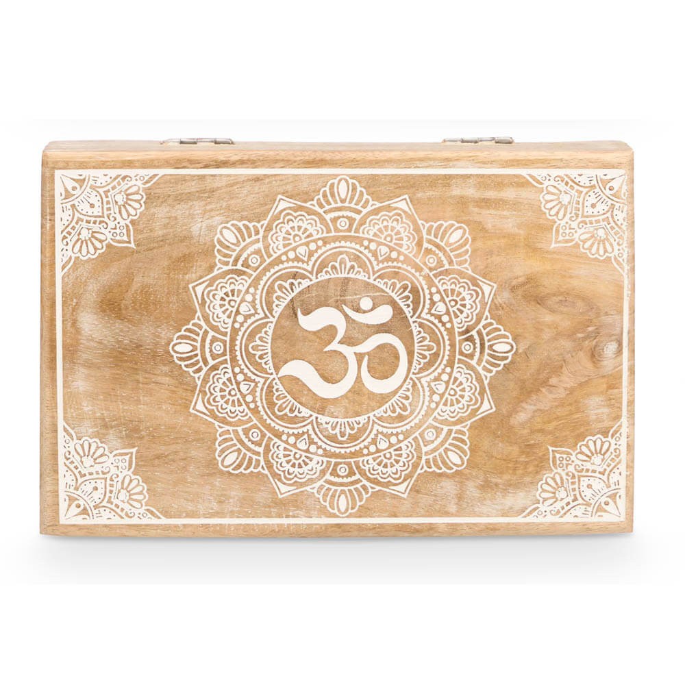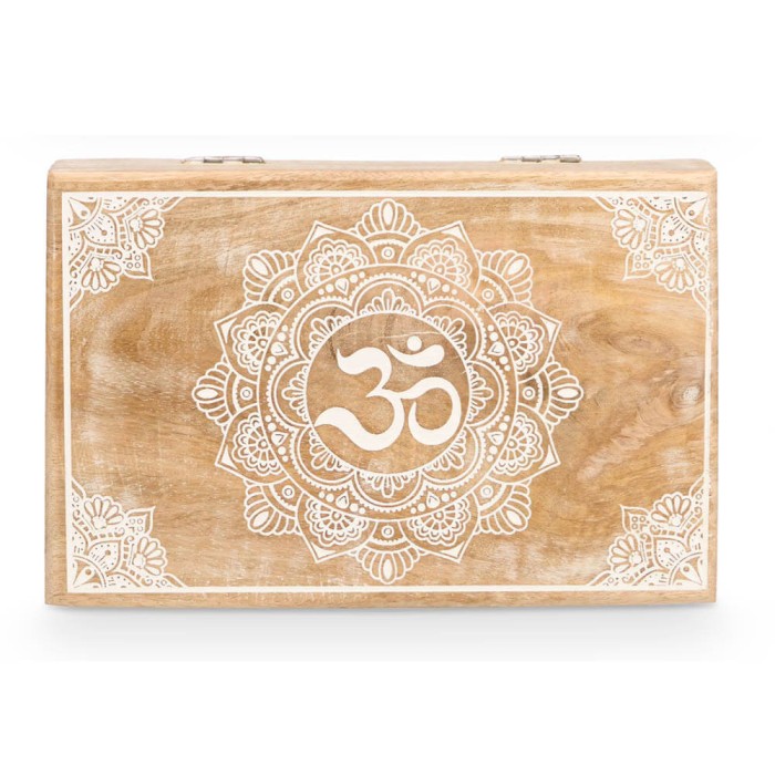 Caja decorada diseño OM realizada en madera de mango con tapa tallada. Dimensiones: 13,5 x 21,5 x 8 cm. Perfecta para guardar joyas y recuerdos.