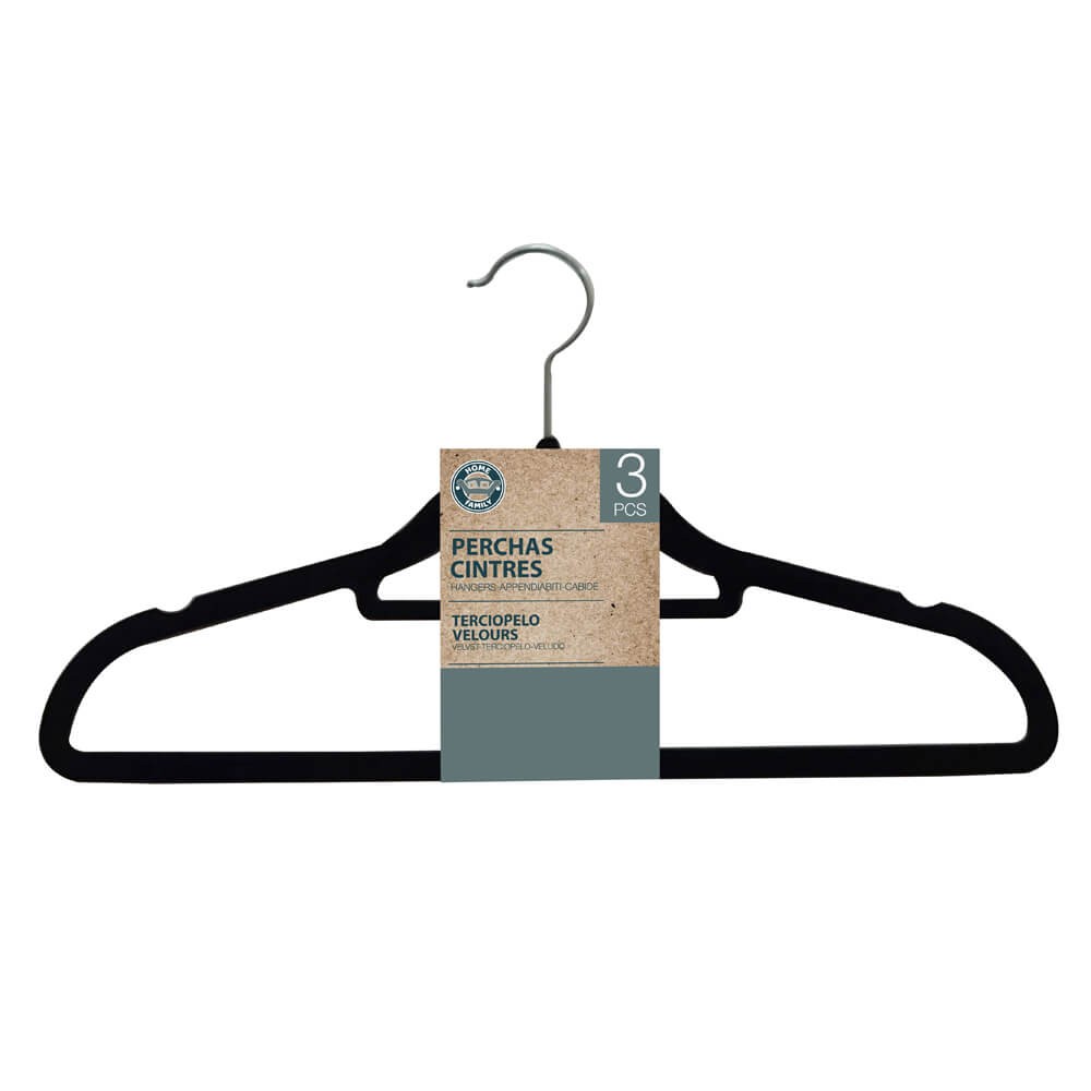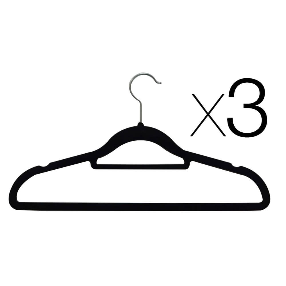 Set de 3 perchas de terciopelo negro antideslizante, diseño delgado y versátil. Perfectas para evitar que las prendas resbalen y maximizar el espacio. Medidas: 41x22x0.5cm.