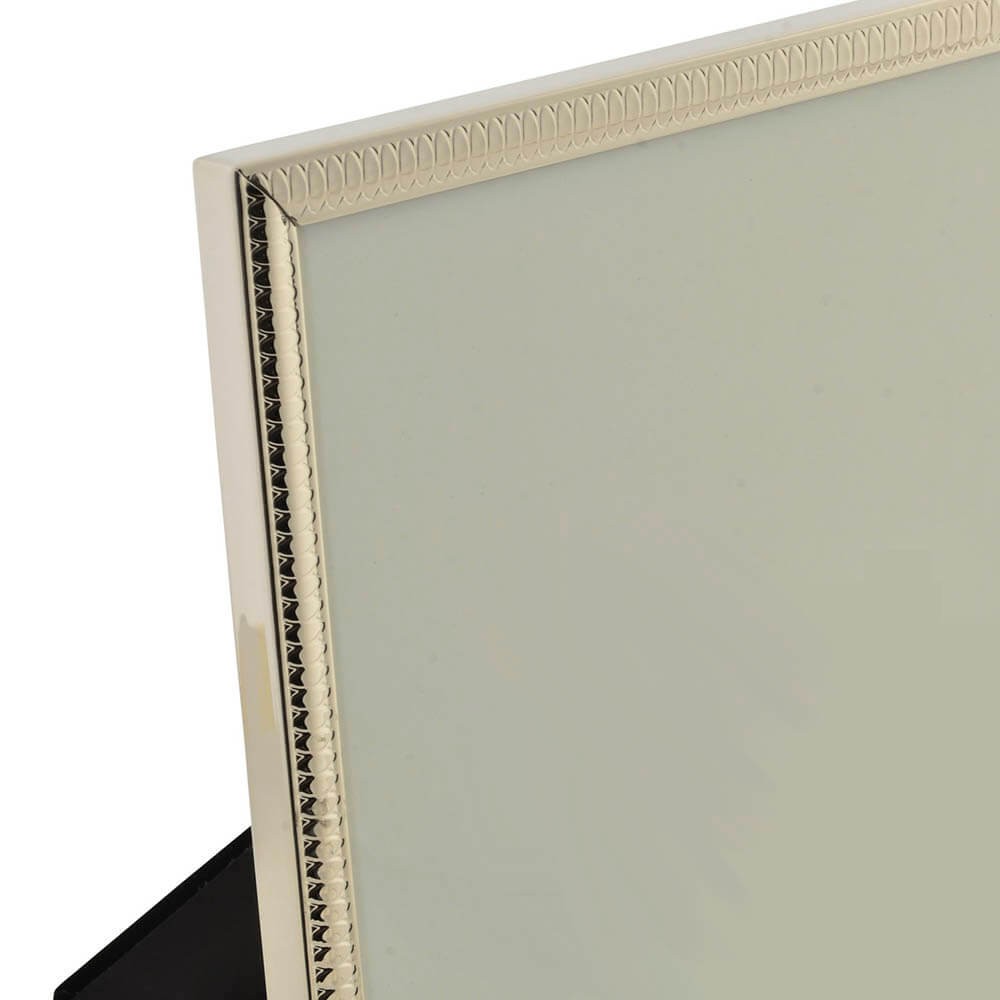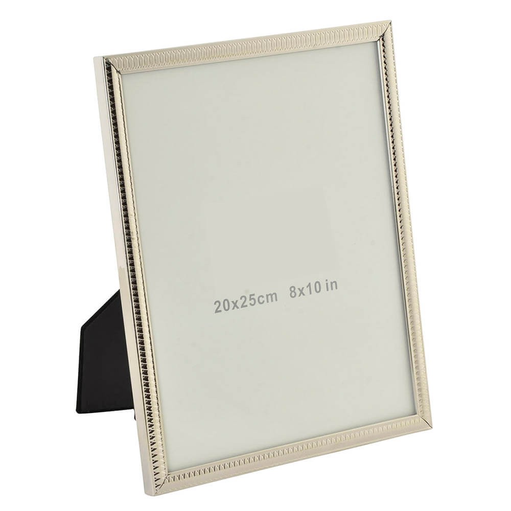 Marco de fotos de sobremesa fabricado en metal cromado para una fotografía de 20x25 cm. El marco esta grabado con dibujos geométricos de diseño clásico en color plateado brillante. Incluye pie para apoyar.