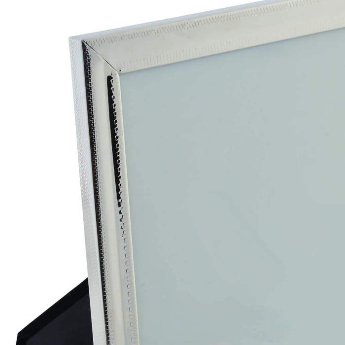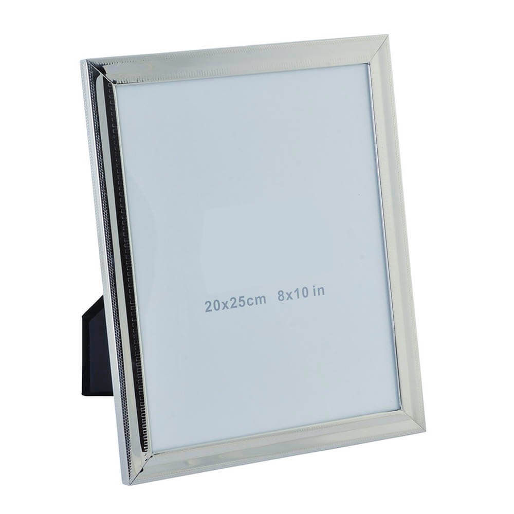Marco de fotos fabricado en metal cromado para una fotografía de 20x25 cm. El marco de diseño clásico en color plateado brillante es perfecto para colocar una foto de boda, comunión, etc. Incluye pie para apoyar.