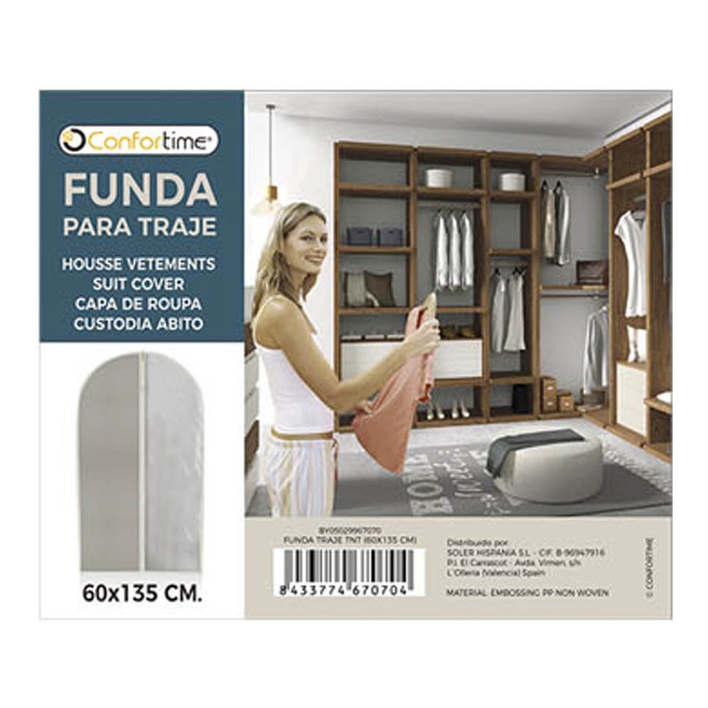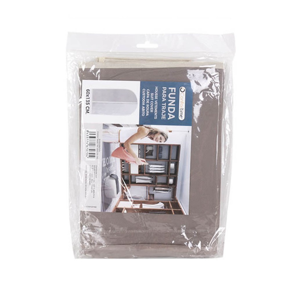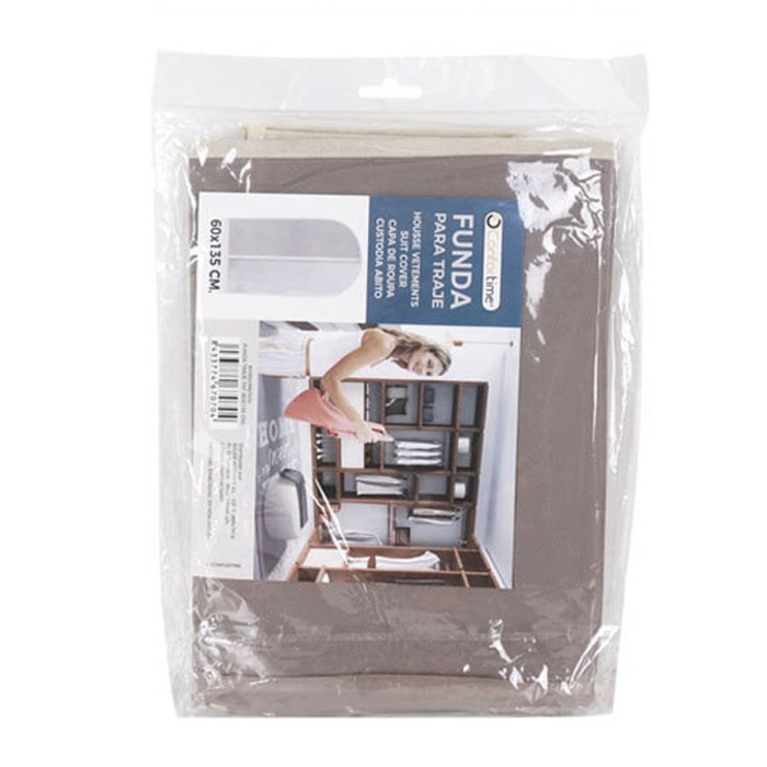 Funda para traje realizada en tela no tejida de color topo y plástico transparente para ver el contenido e identificar la prenda sin necesidad de abrir la bolsa guardar trajes. La funda protectora mantiene la ropa alejada de las polillas, el polvo y del roce con otras prendas para evitar brillos.