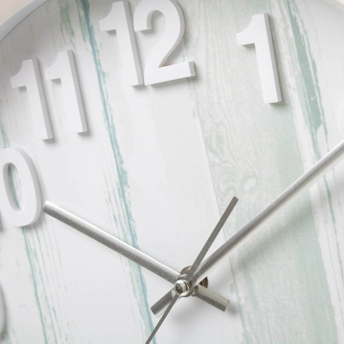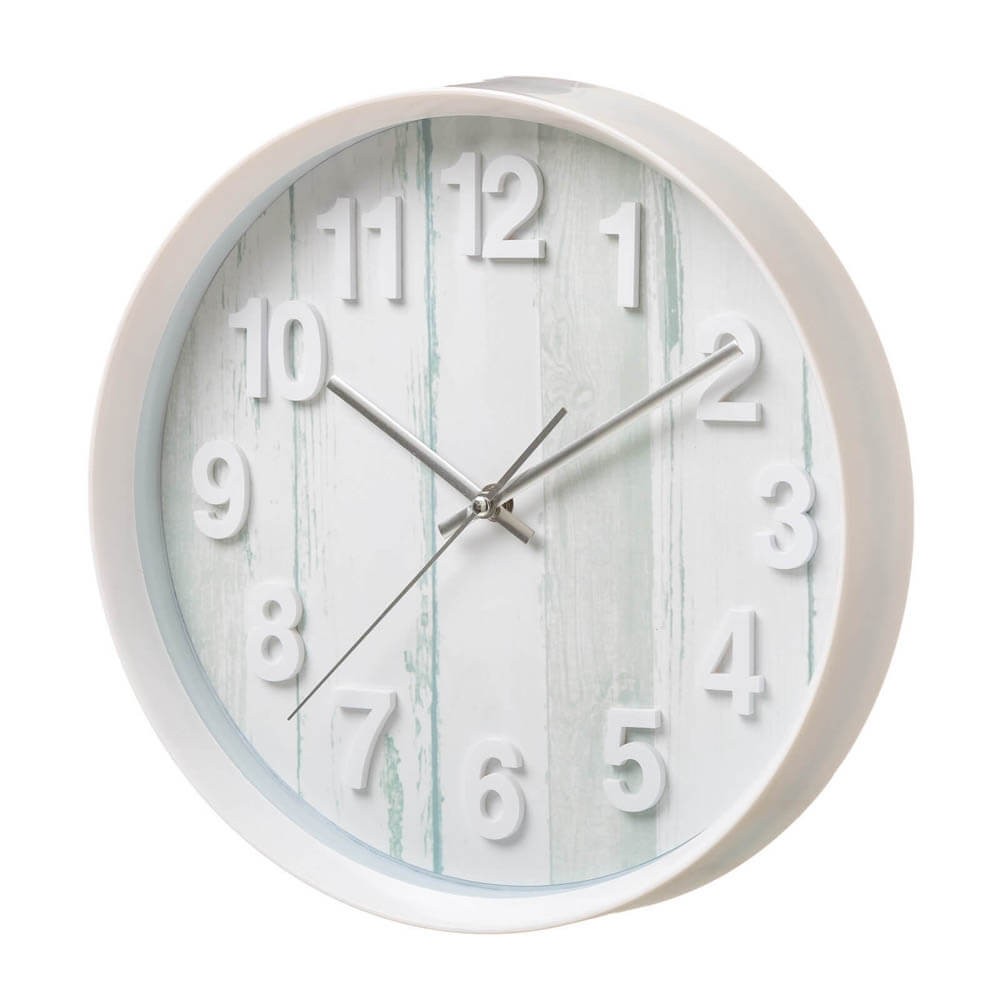 Reloj de pared con marco de plástico blanco y esfera con foto impresión imitación madera. Este reloj es perfecto para la cocina, sus números grandes y en relieve facilitan la lectura. Gracias a su mecanismo con maquinaria de movimiento continuo, el reloj no genera ningún ruido como el incómodo tic-tac. Sistema de anclaje integrado en el mecanismo.