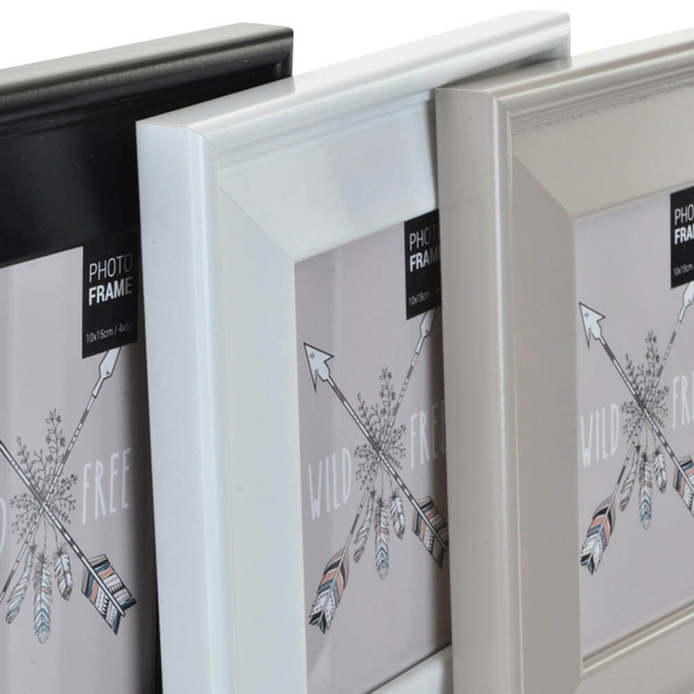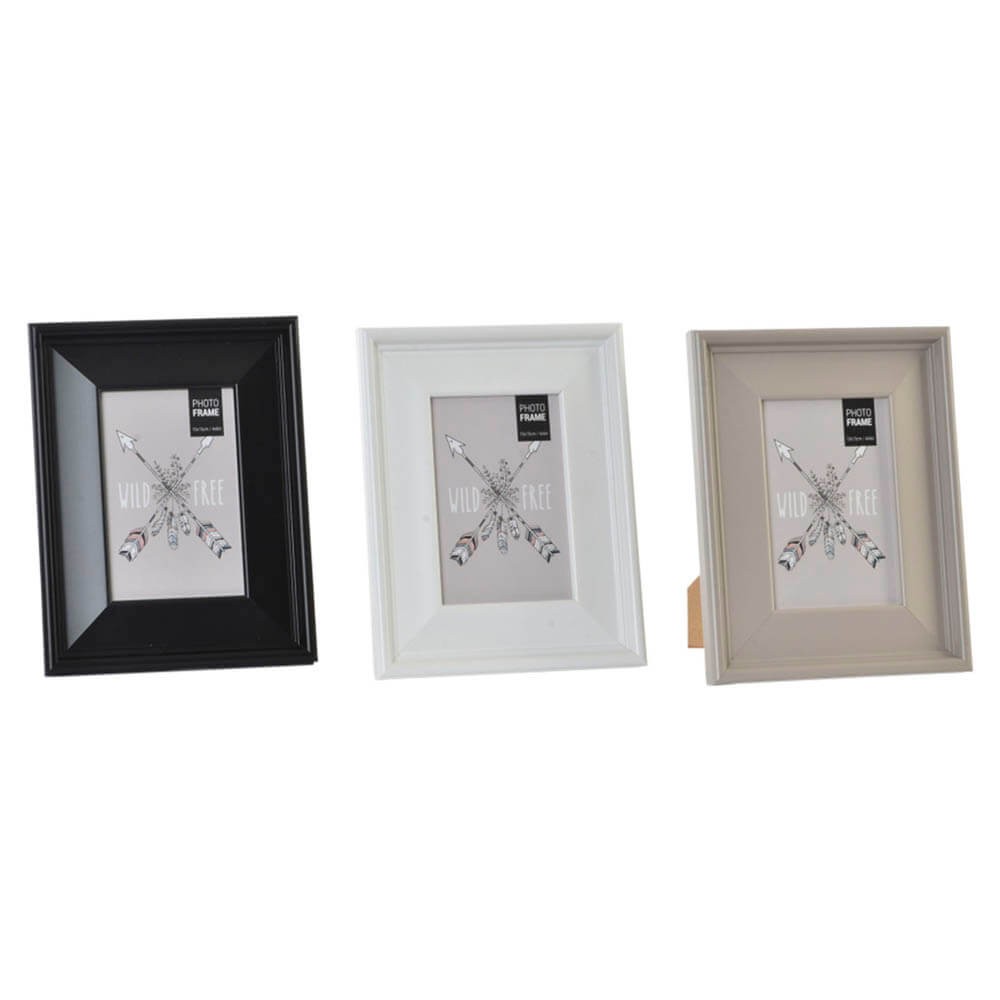 Marco de fotos realizado en poliestireno de estilo clásico. Si buscas un marco de fotos barato que aporte estilo a tu hogar, elige entre estos portafotos 10x15 cm disponibles en color blanco, negro o topo, perfectos para conservar tus fotografías y rodearte de los mejores momentos. Puedes decantarte por un color o combinar los colores, serán el complemento ideal de decoración para tu salón, dormitorio, entrada, etc.