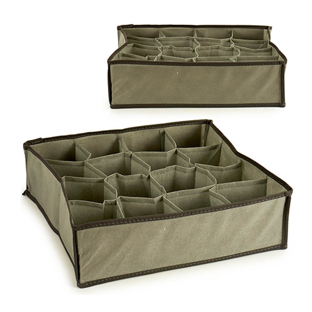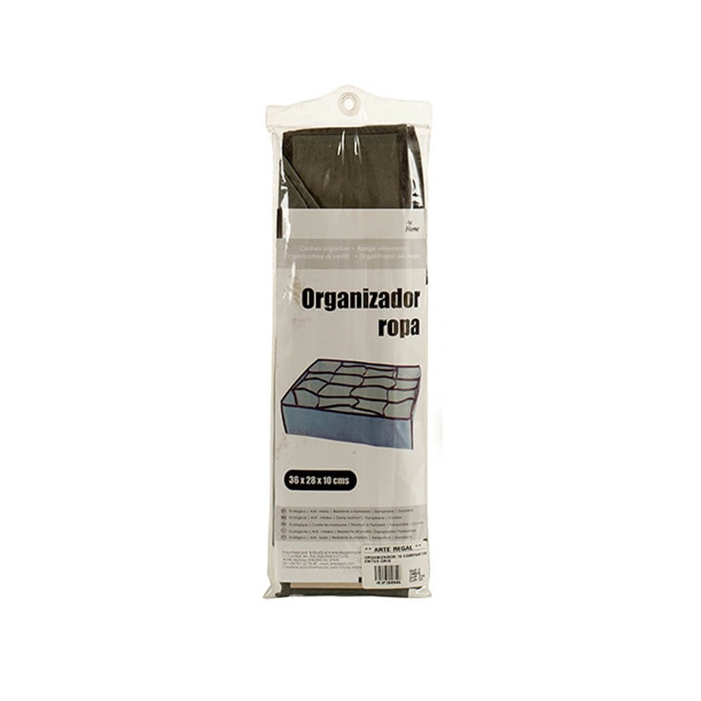 Organizador de armarios para cajón o balda realizado en tejido no tejido plegable con 16 departamentos, muy útil para guardar y organizar cosas. Este organizador de cajones en color gris es muy práctico para organizar ropa interior, calcetines, pañuelos, cinturones, bisutería, etc.