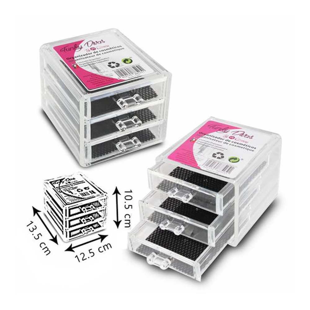 Organizador con tres cajones realizado en metacrilato transparente, material resistente y duradero. La caja es perfecta para guardar y organizar maquillaje y artículos de pequeño tamaño, gomas de pelo, pinzas, horquillas, etc. El material con el que esta realizada es de fácil limpieza, además de discreto sobre cualquier superficie.