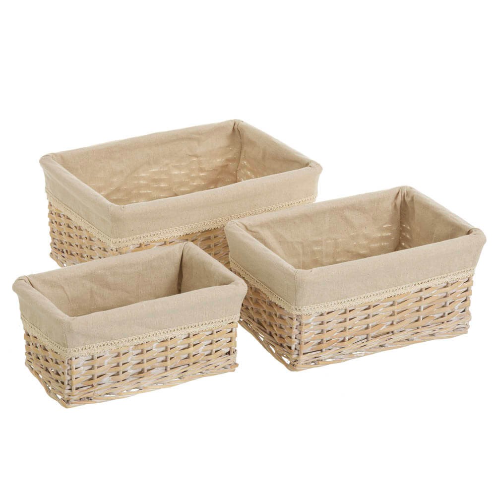 Cesto de mimbre trenzado de alta calidad con forro en tela de lino natural acabado con puntilla decorativa, diseño clásico en color crema.
