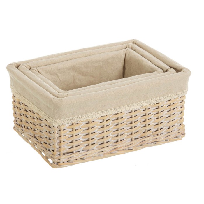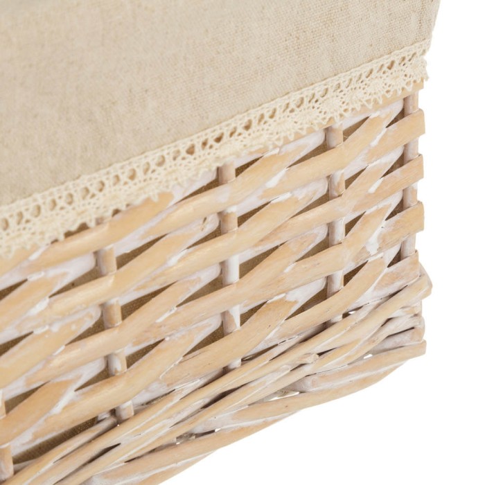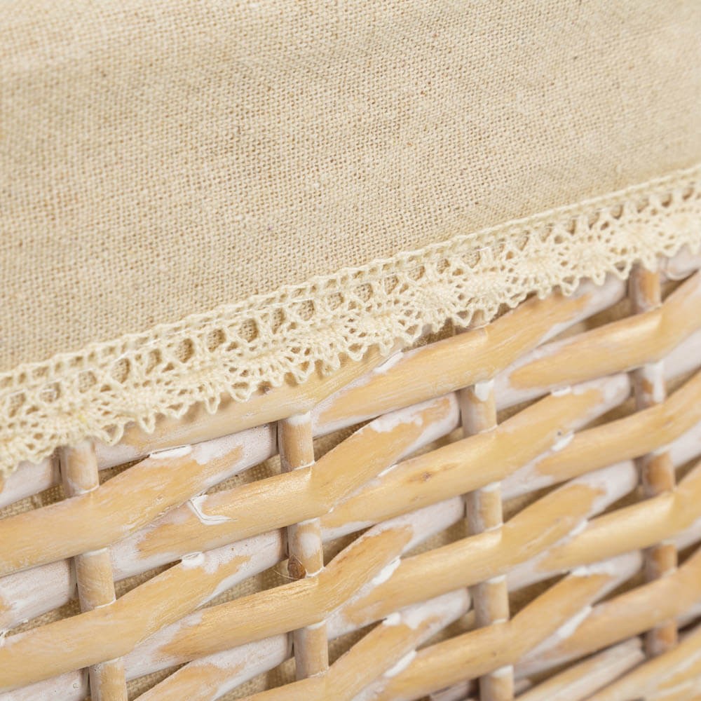 Cesto de mimbre trenzado de alta calidad con forro en tela de lino natural acabado con puntilla decorativa, diseño clásico en color crema.