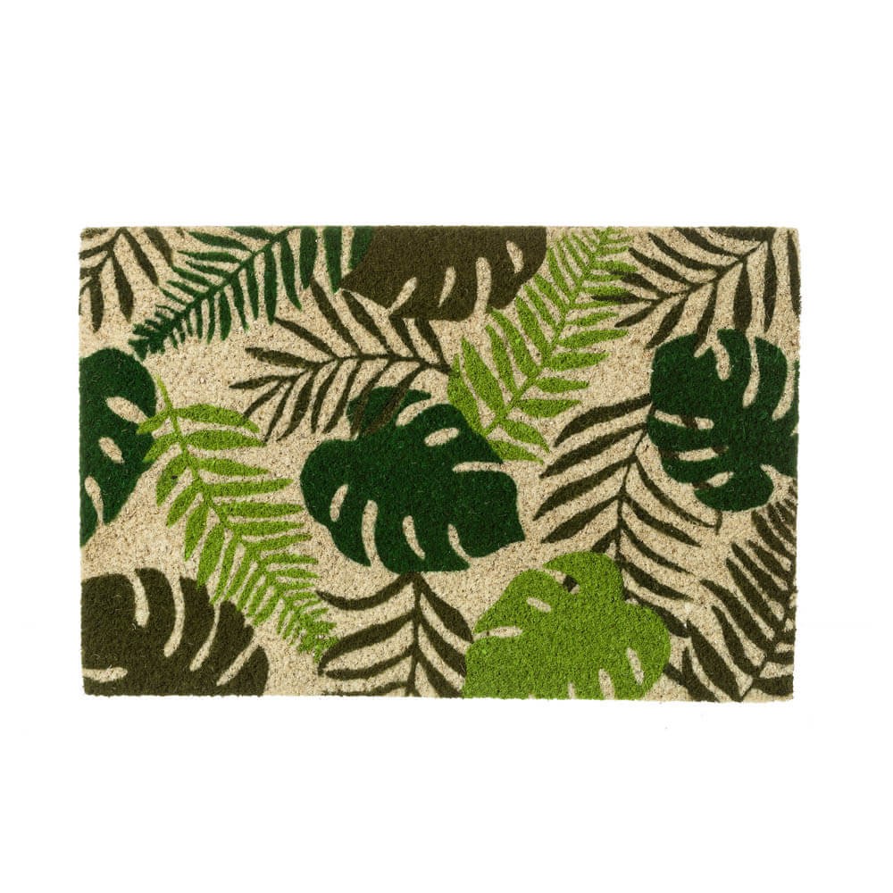 felpudo realizado en fibra de coco decorado con hojas de estilo tropical en tonos verdes, lleva la base de PVC antideslizante para evitar caídas. El felpudo es práctico y decorativo, muy útil para quitar la suciedad del calzado antes de entrar en casa.
