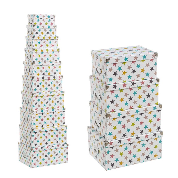 Caja de cartón rectangular con esquinas reforzadas para mayor resistencia y asas metálicas, decorada con un original diseño de estrellas multicolor, muy práctica para guardar y organizar cosas ayudándote a mantener el orden en casa.