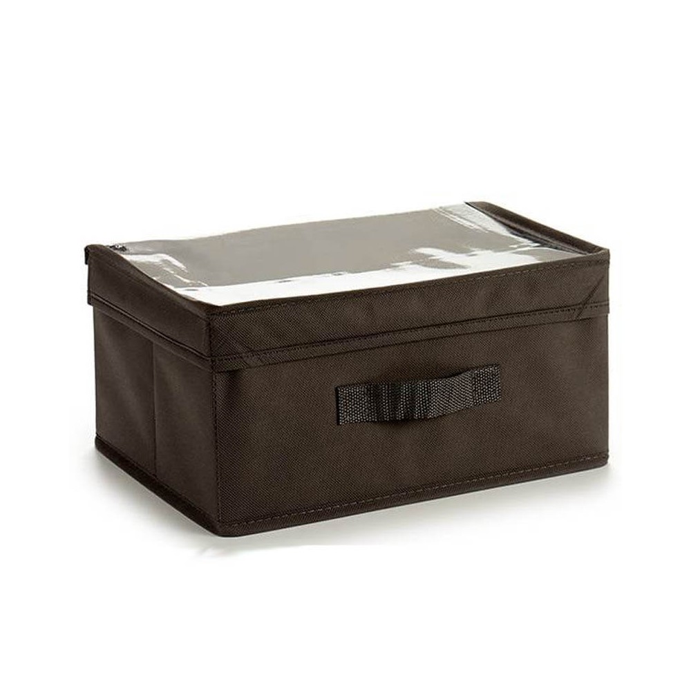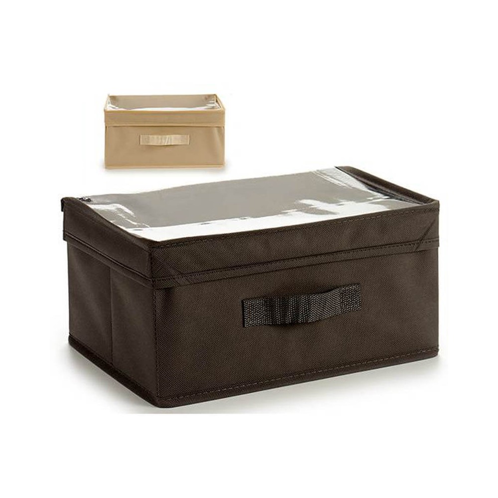 Caja organizadora realizada en textil no tejido de color crema o chocolate, muy práctica para guardar las prendas de ropa en el cambio de temporada, lleva ventana de PVC transparente para ver el contenido en todo momento.